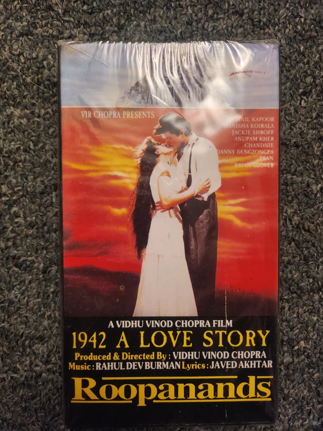 This is the Hindi film "1942 A Love Story" on VHS. It's directed by Vidhu Vinod Chopra. The movie stars Anil Kapoor, Manisha Koirala, and Jackie Shroff. This tape is sealed in its original packaging. This is an extremely rare item.