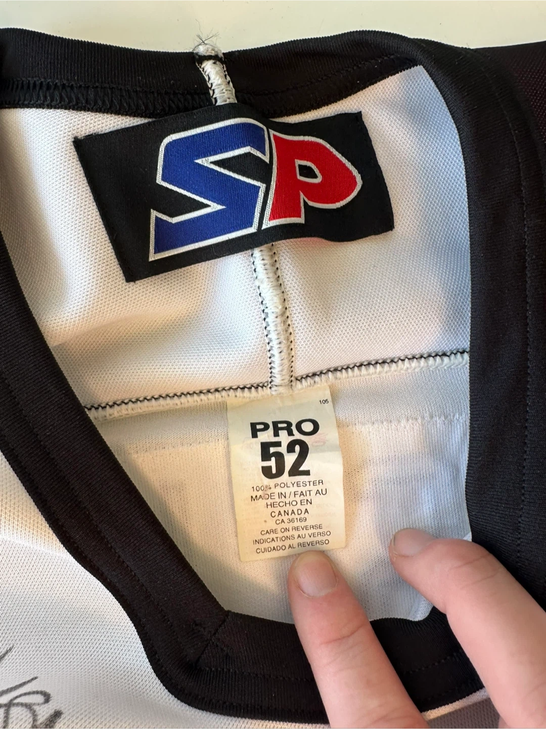 This is a PRO 52 hockey jersey featuring signed Markus Naslund and the number 19. It's made of 100% polyester. The jersey also has the NHLPA logo on the front. Been in storage for about 24 years