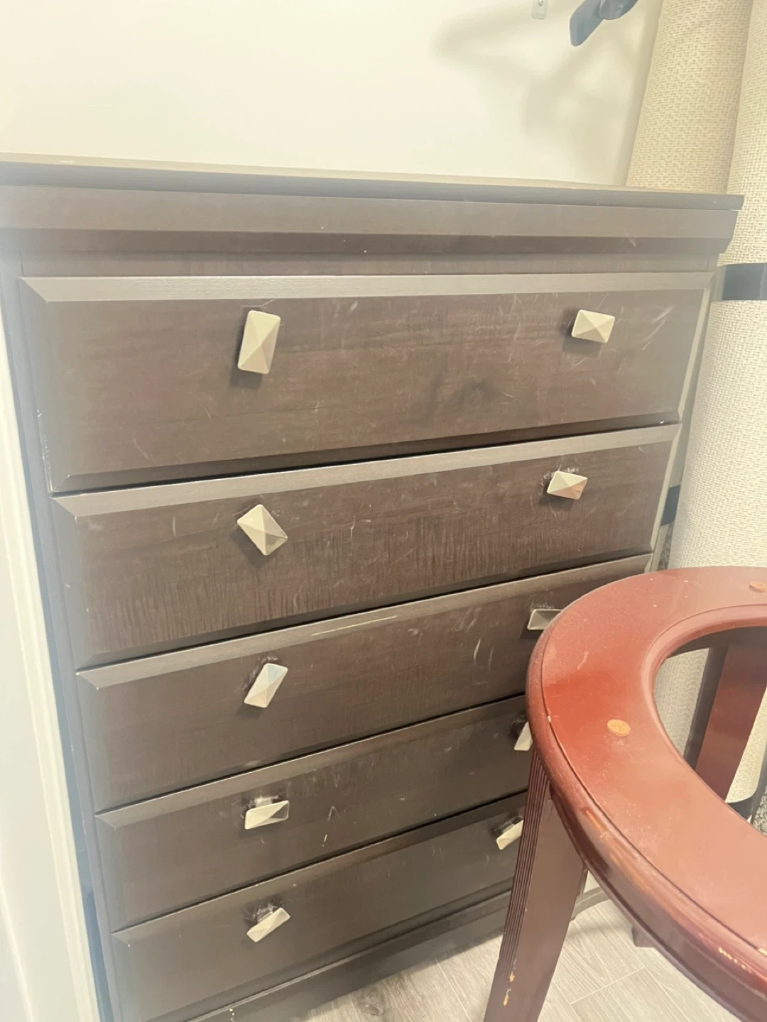 A dark brown dresser with five drawers. Each drawer has a distinct silver-toned geometric knob. This piece offers ample storage space for your bedroom or closet.