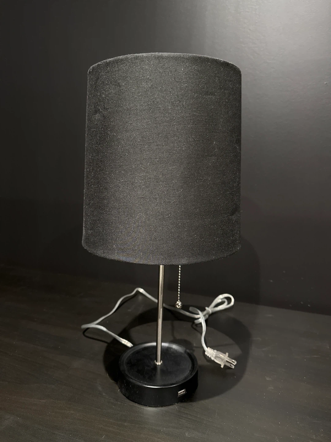 This black table lamp features a fabric shade and a metal base. It includes a convenient USB port for charging devices. The lamp has a pull chain for easy on/off operation. This would be useful for bedside tables or desks.