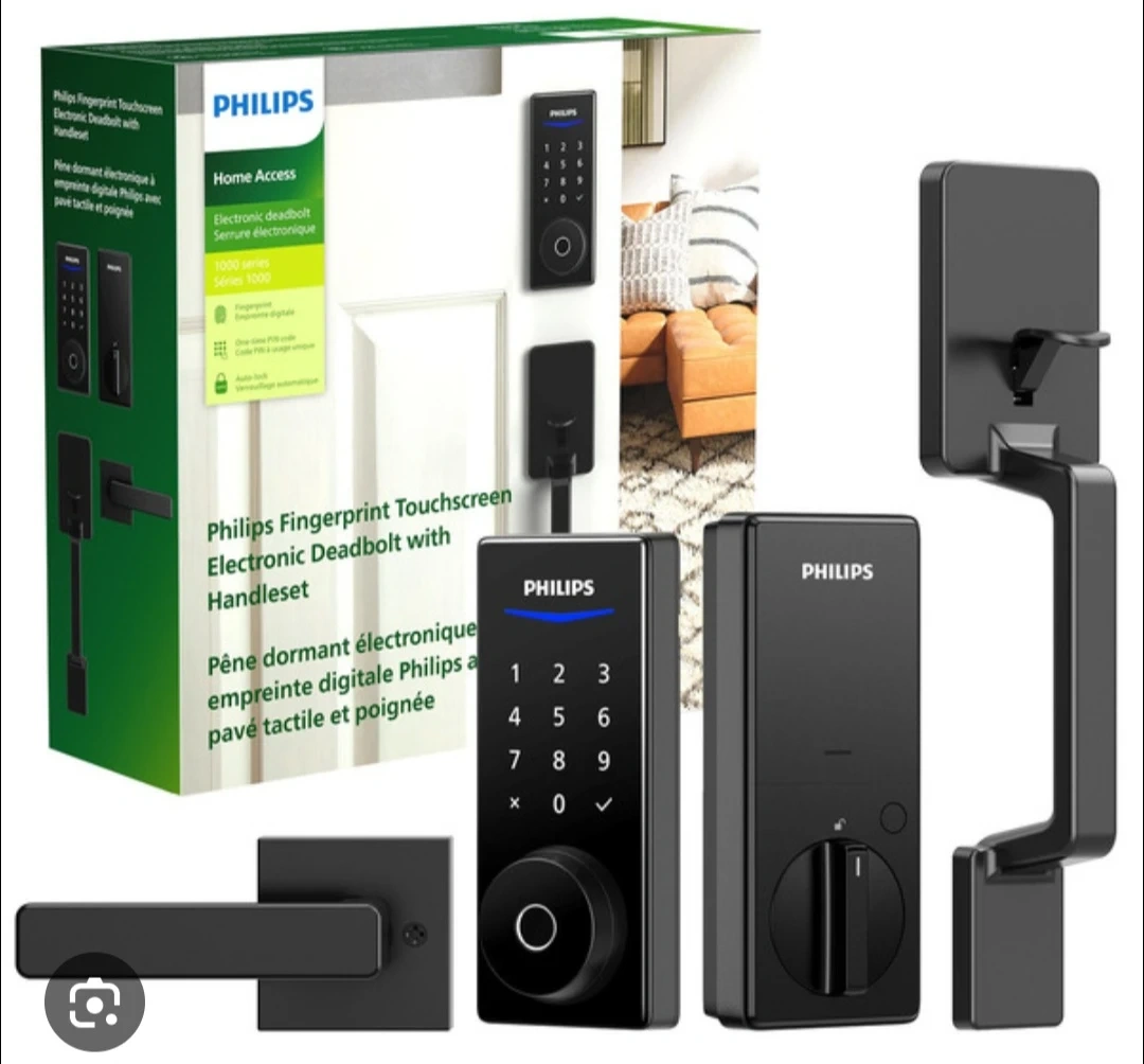 Philips Fingerprint Touchscreen Electronic Deadbolt with a handleset. It's from the 1000 series. Features fingerprint, PIN code, and auto-lock functions. It's a black electronic deadbolt.