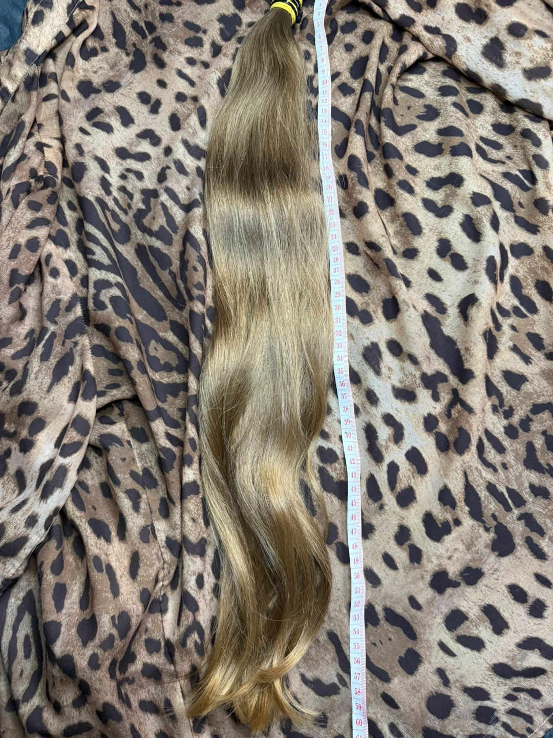 This is a long blonde hair extension. The hair is approximately 21 inches long, measured from the tie. It has a natural wave. The colour is a light blonde with subtle highlights.