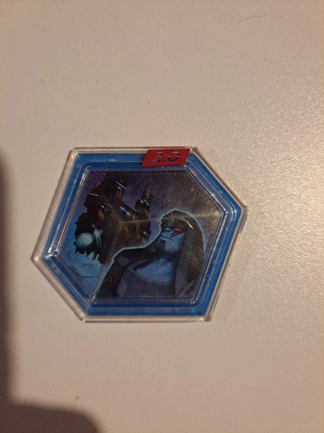 This is a Disney Infinity 2.0 Marvel figure base. It's compatible with Marvel characters and playsets. The base is blue with a hexagonal shape.