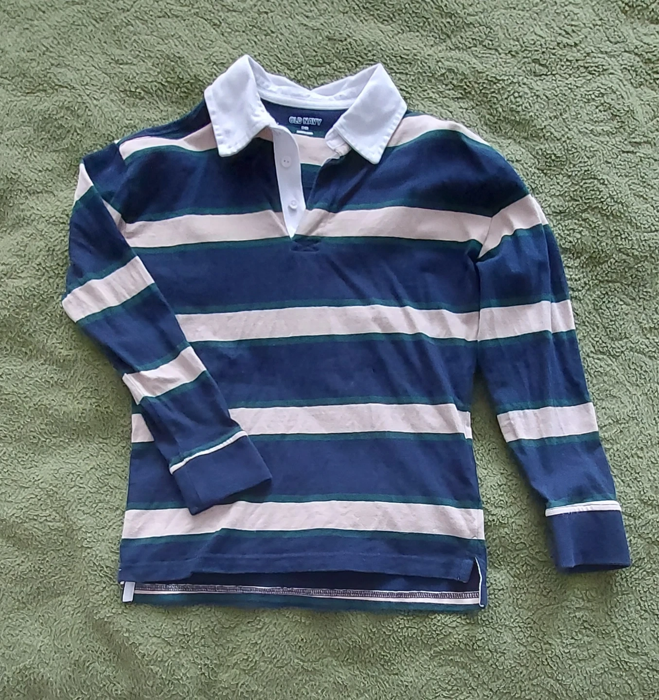 Old Navy long-sleeve rugby shirt with a classic collar and button placket. Features navy, beige, and green stripes. Made in India. Size medium, 8yr.