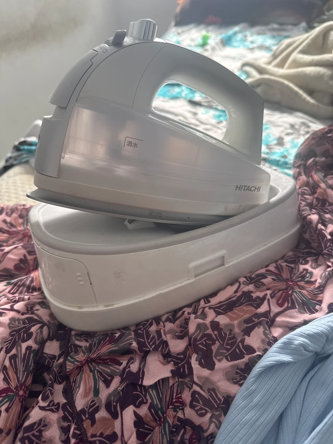 This is a Hitachi CSI-305 cordless steam iron. It has a ceramic soleplate for smooth gliding. The iron has three temperature settings: high, medium, and low. It's great for keeping clothes looking sharp!