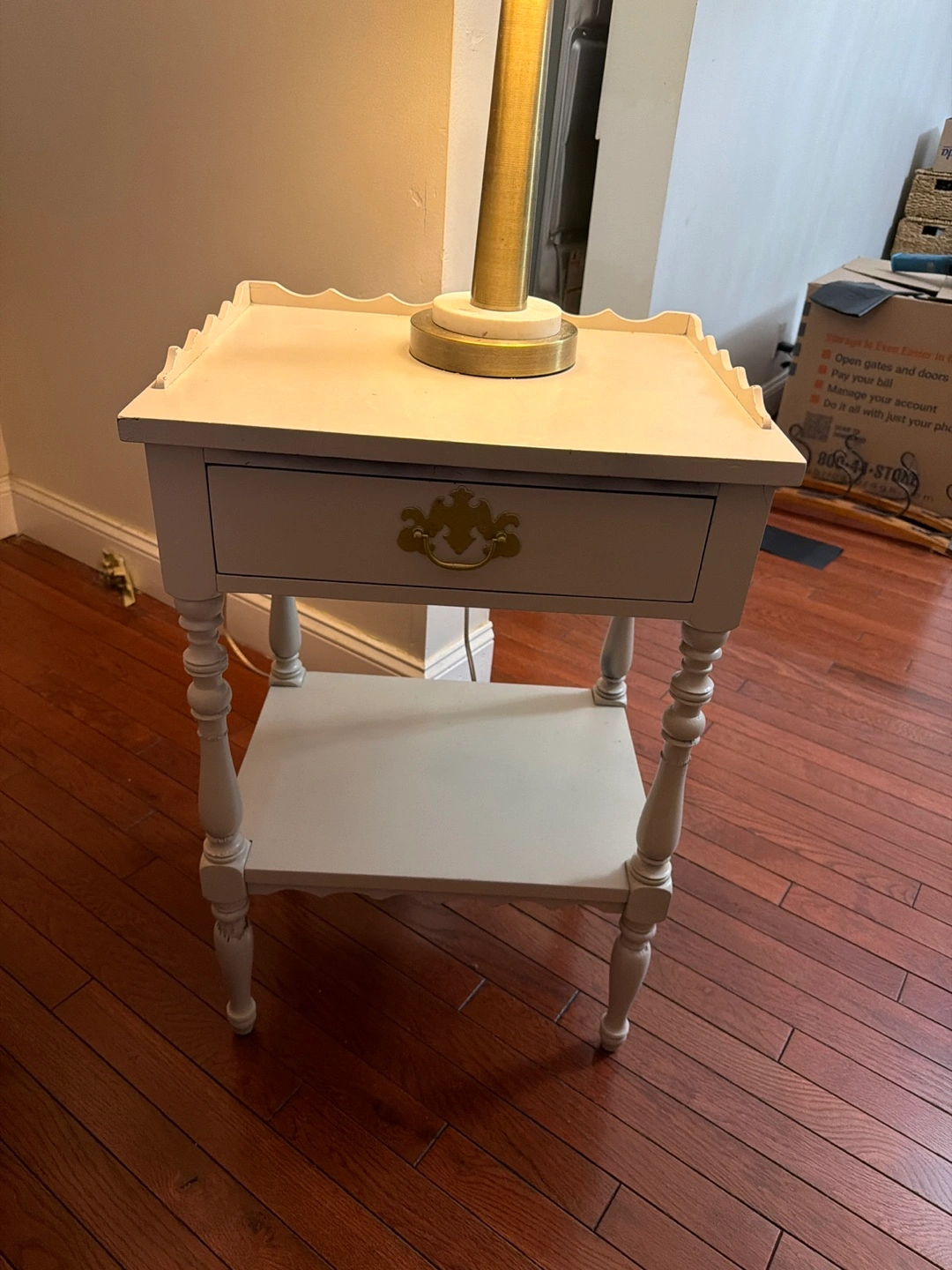 This accent table features a scalloped top and a single drawer with a decorative brass pull. It has a lower shelf for additional storage. The table is painted a light grey color and has turned legs. It's a great piece for a bedroom or living room!
