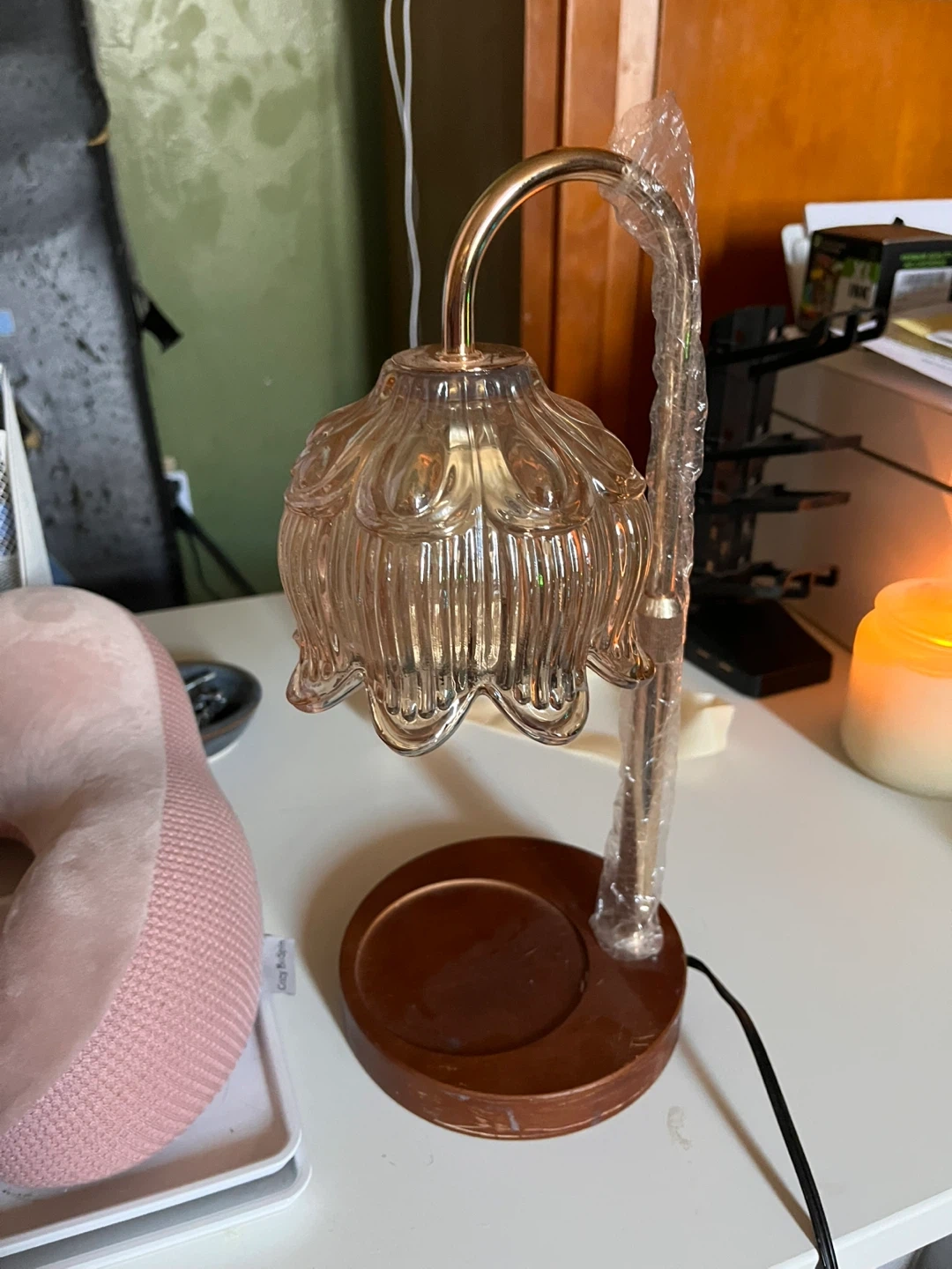 This is a lovely amber glass accent lamp with a vintage-inspired design. It has a metallic gold-toned arm and a rich brown base. It's perfect for adding a warm glow to any room!