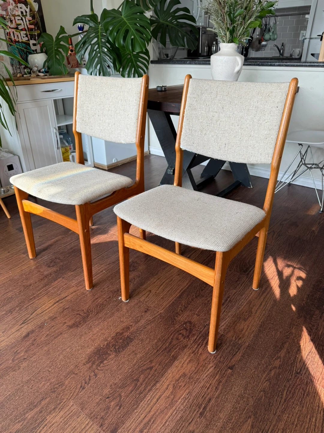 In original unaltered condition, with solid teak frames showing beautiful grain and curved, upholstered backrest and seat pad, in okay condition, you would be hard pressed to find many vintage chairs that represent the Danish design aesthetics in this condition.