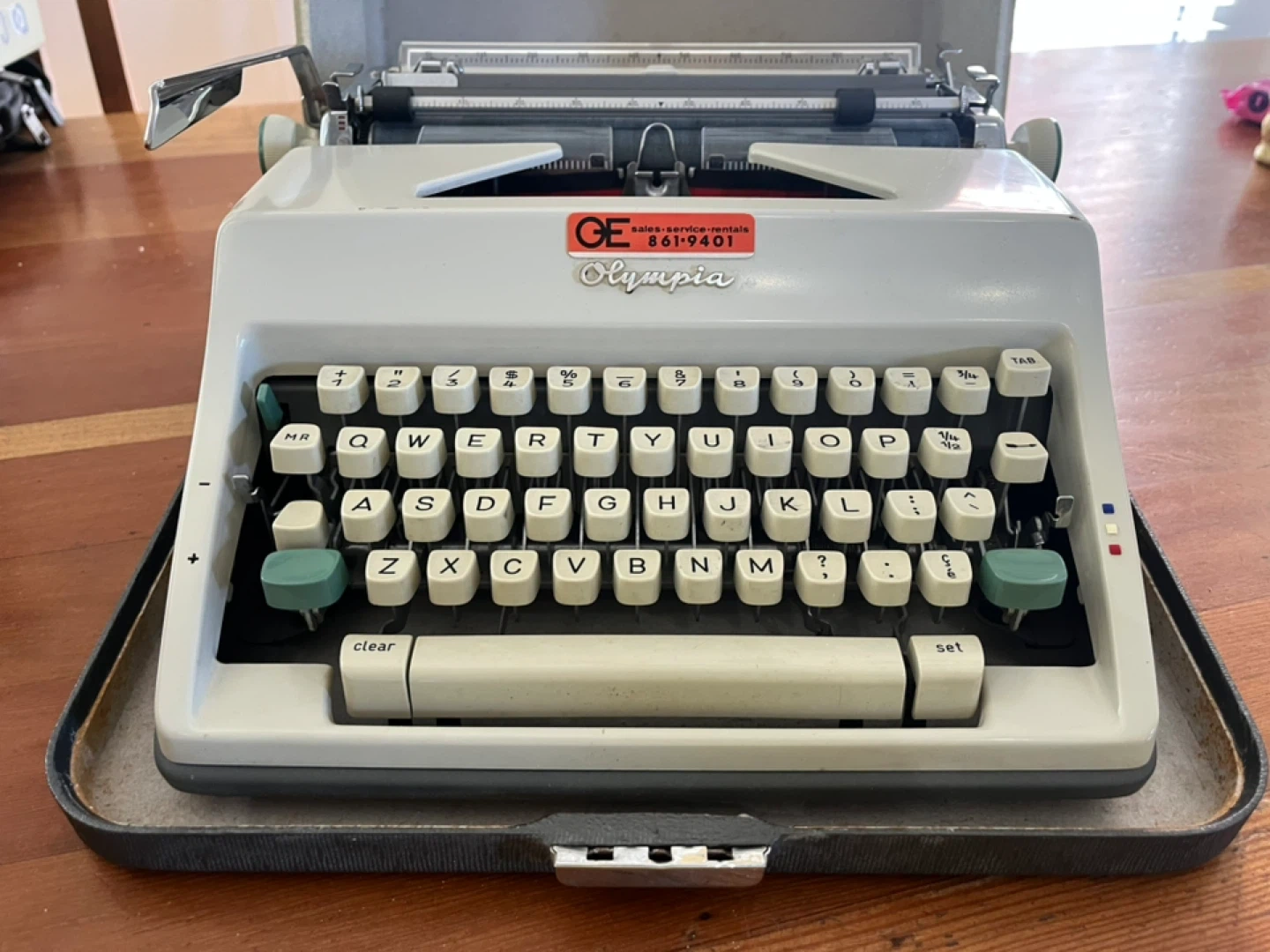 Working vintage Olympia DeLuxe typewriter in a portable case. This mechanical typewriter was made in Western Germany in the 1960’s and includes the original carrying case. It works—there is one broken plastic knob cover (see last photo) but it doesn’t impact functionality. Perfect for collectors and writers seeking a tactile, analog experience.