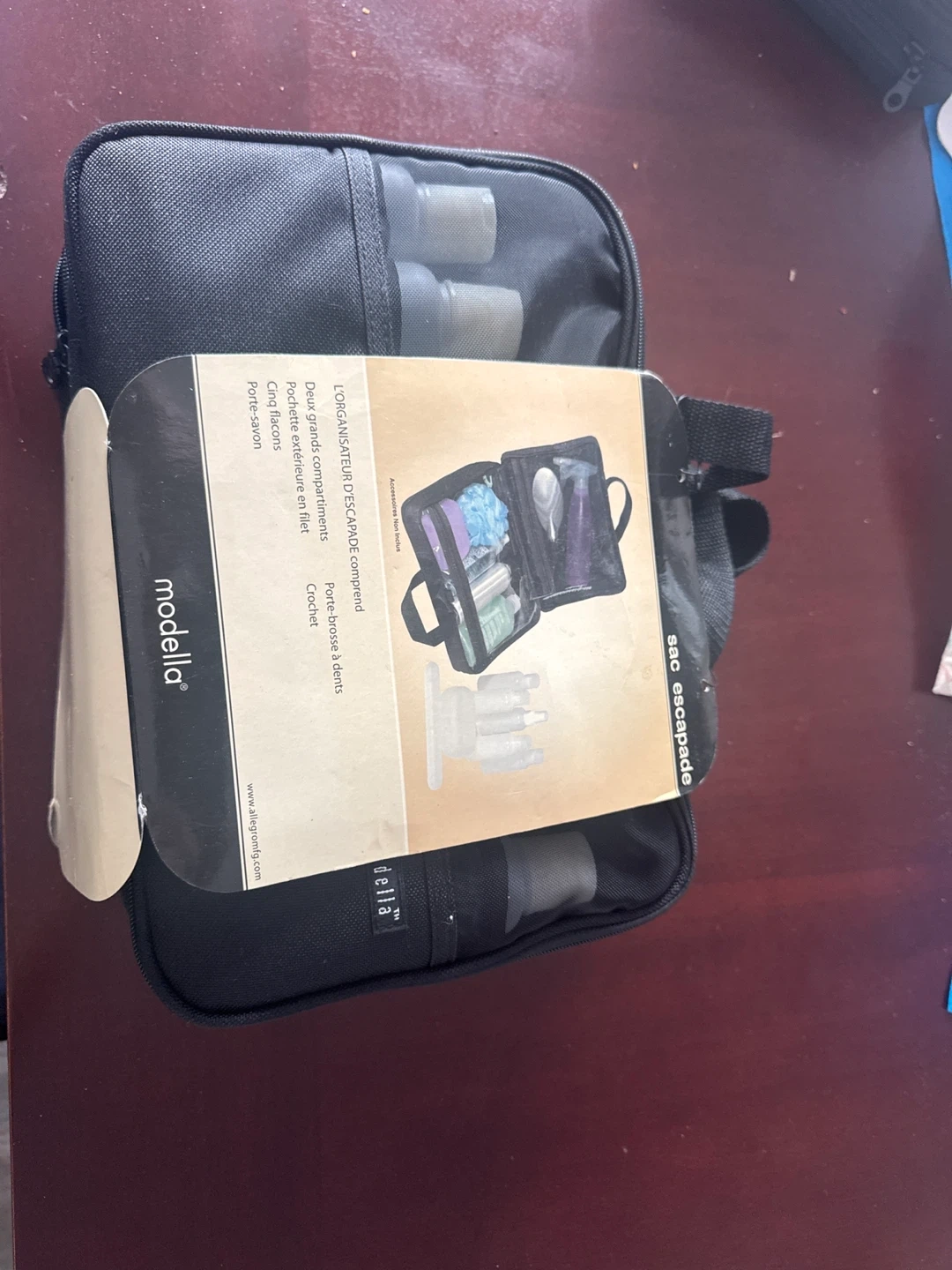 This Modella toiletry bag is designed for travel. It has two large compartments and an exterior mesh pocket. Includes five small bottles and a soap dish. Accessories are not included I have 2 for sale