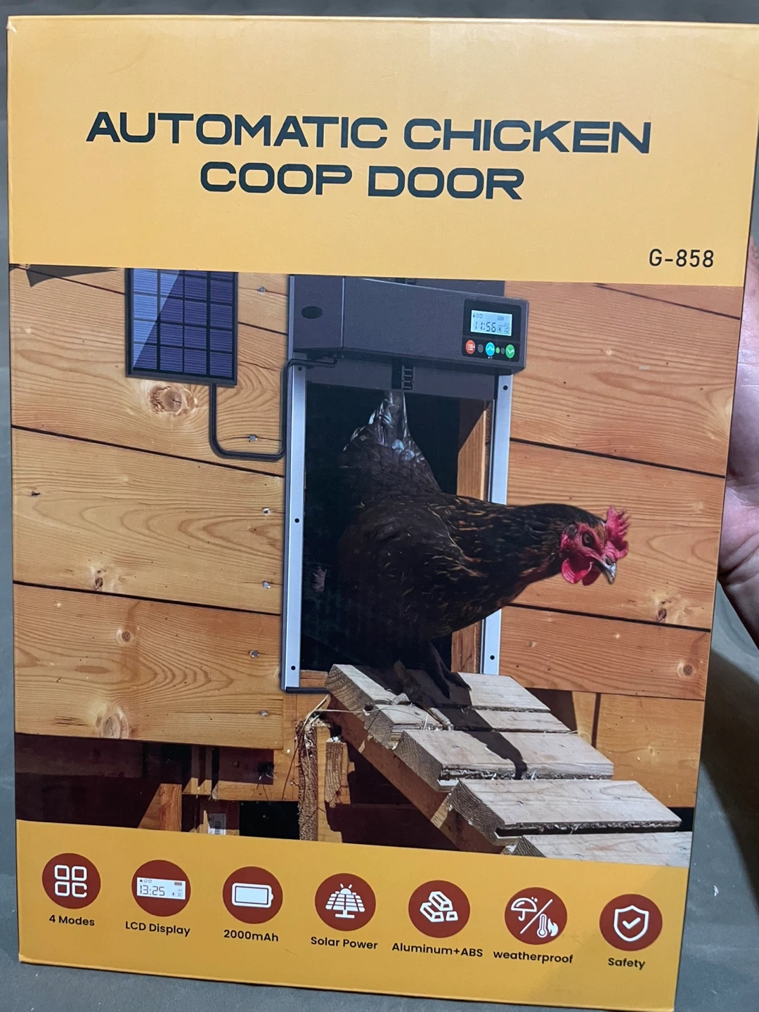 Automatic chicken coop door for poultry guard. Works with all wooden chicken coops. Protects chickens from predators. Features 4 modes, LCD display, 2000mAh battery, solar power, and is weatherproof. Made from Aluminum+ABS.