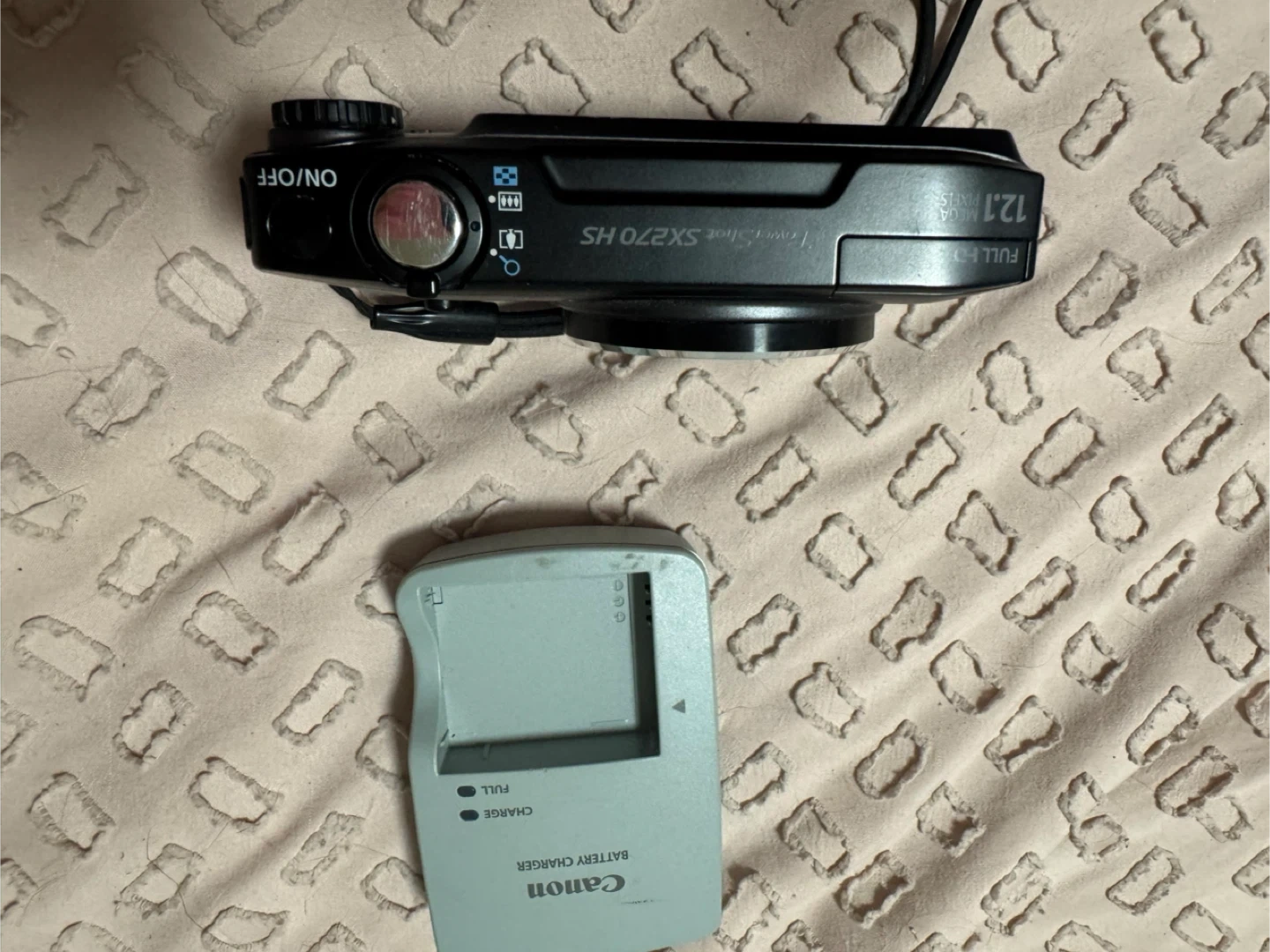 Canon PowerShot SX270 HS digital camera with 20x optical zoom. Includes Canon battery charger and battery. Camera has 12.1 megapixels.