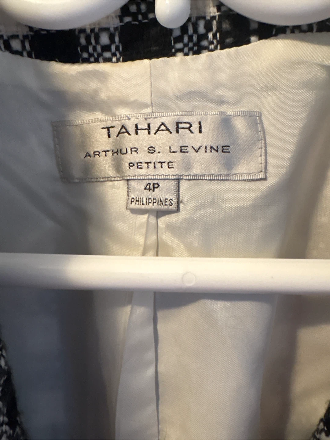 Here's a Tahari Arthur S. Levine blazer in a black and white plaid pattern. It's a petite size 4P. The blazer has a unique frayed trim and a classic look!