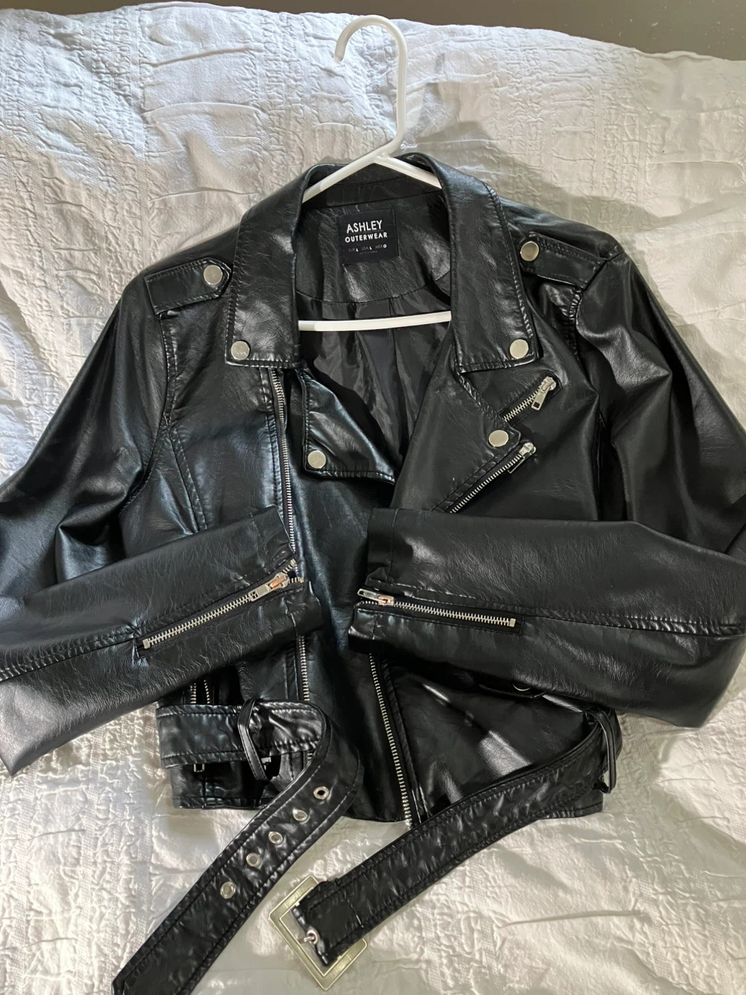 Black faux leather moto jacket by Ashley Outerwear. Features silver hardware, zip-up front, and a belted waist. Material is faux leather.