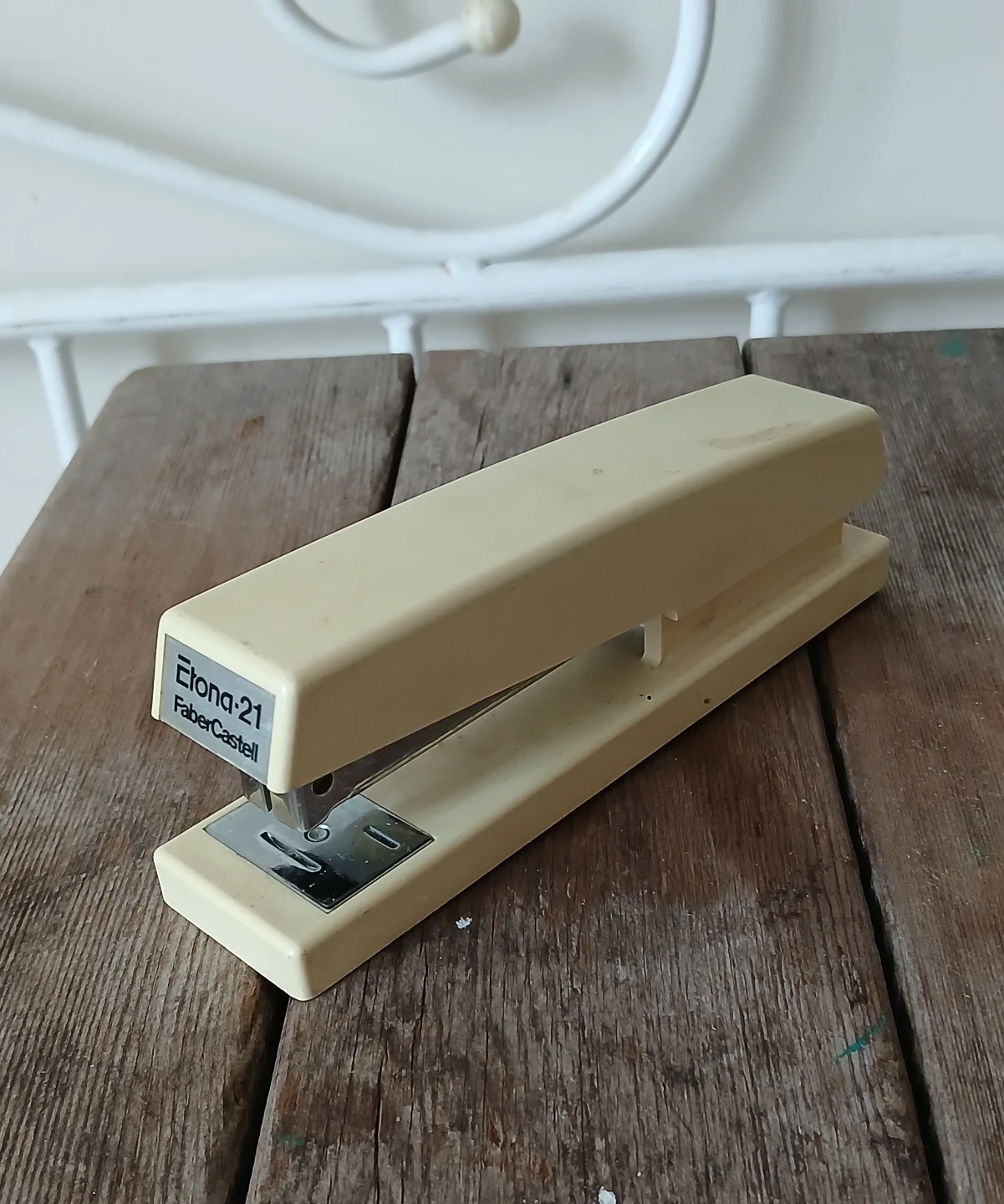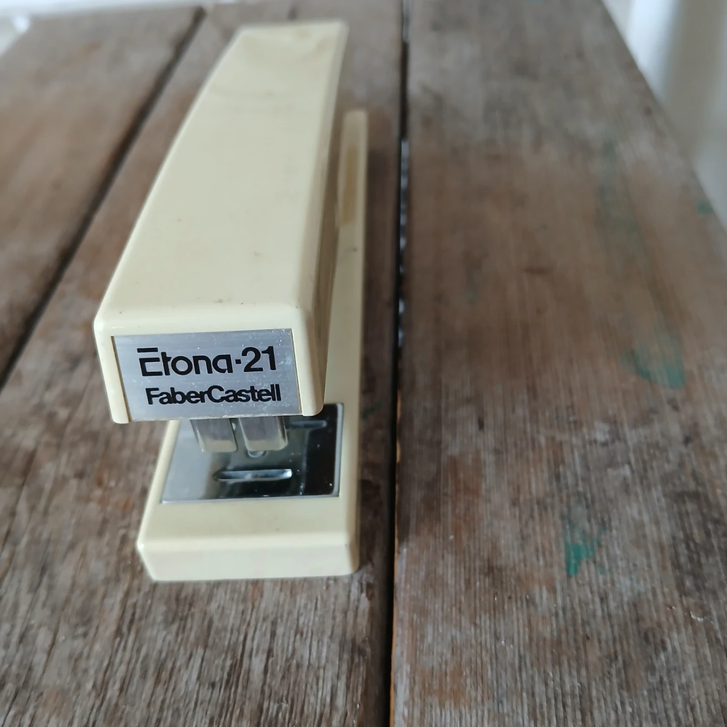 This is a vintage Faber-Castell "Etona-21" stapler. It's a sturdy, cream-coloured office tool. It's great for any desk or home office setup!