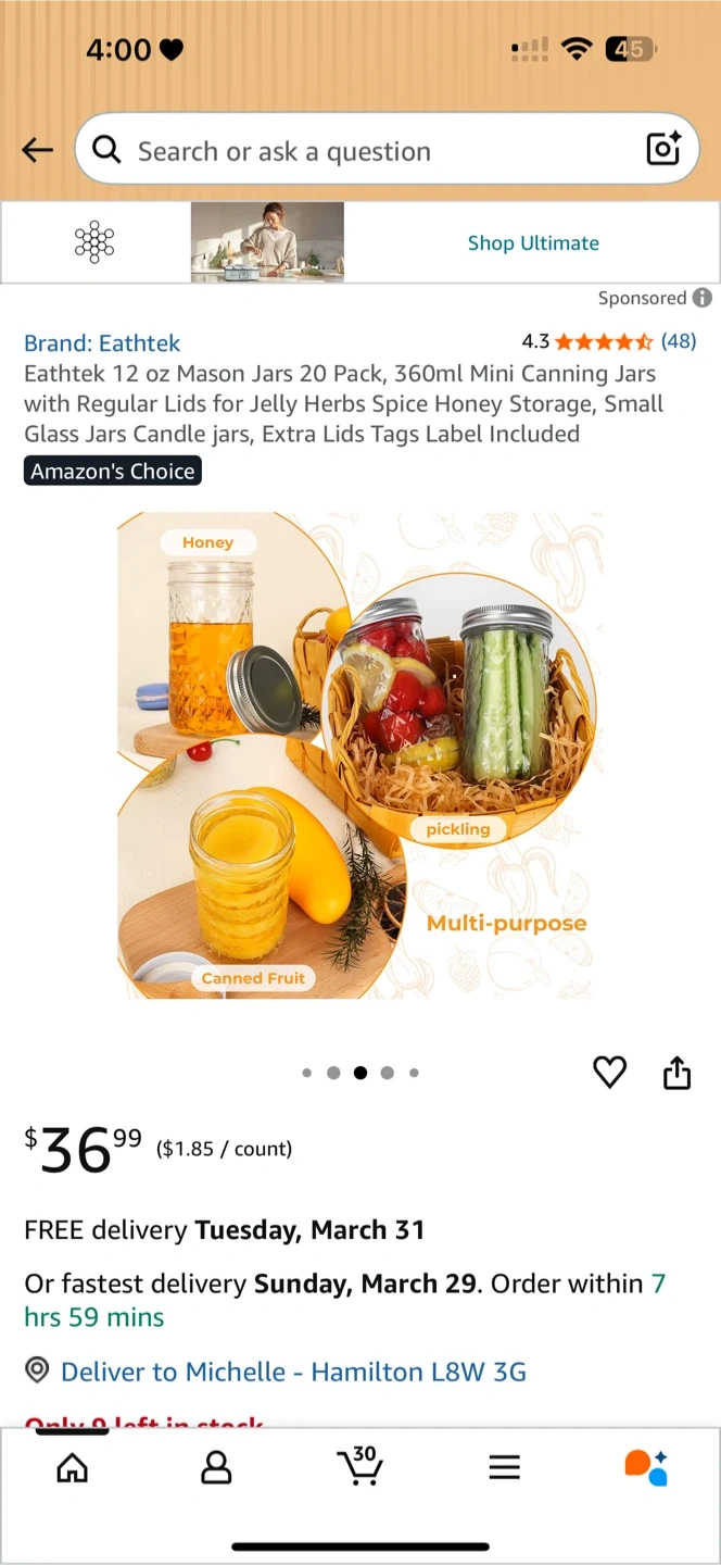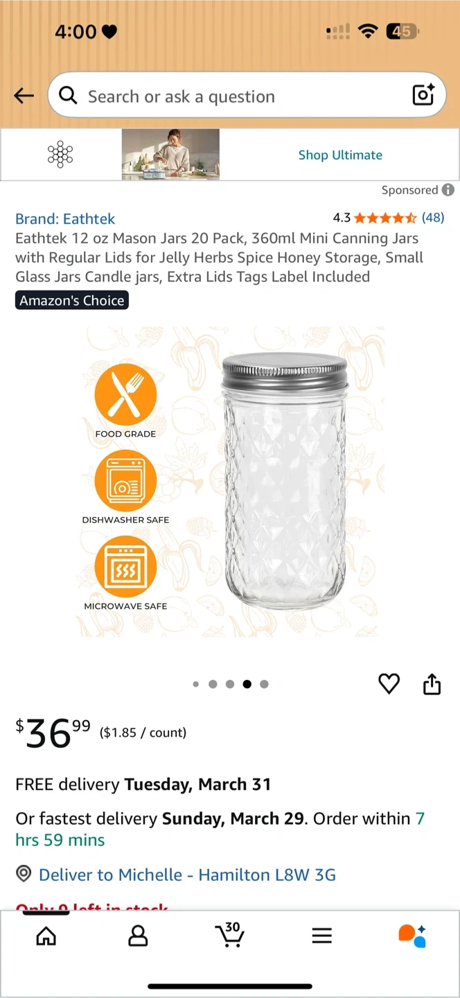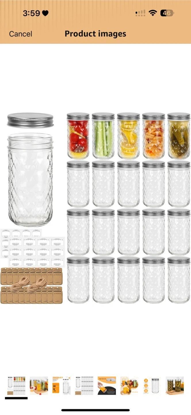 D This is a 20-pack of Eathtek 12 oz mason jars, each with a 350 ml capacity. The jars are made of clear glass with diamond-patterned texture and come with silver metal lids. They're suitable for canning, jelly, herbs, spice storage, and candle making. Dishwasher safe.