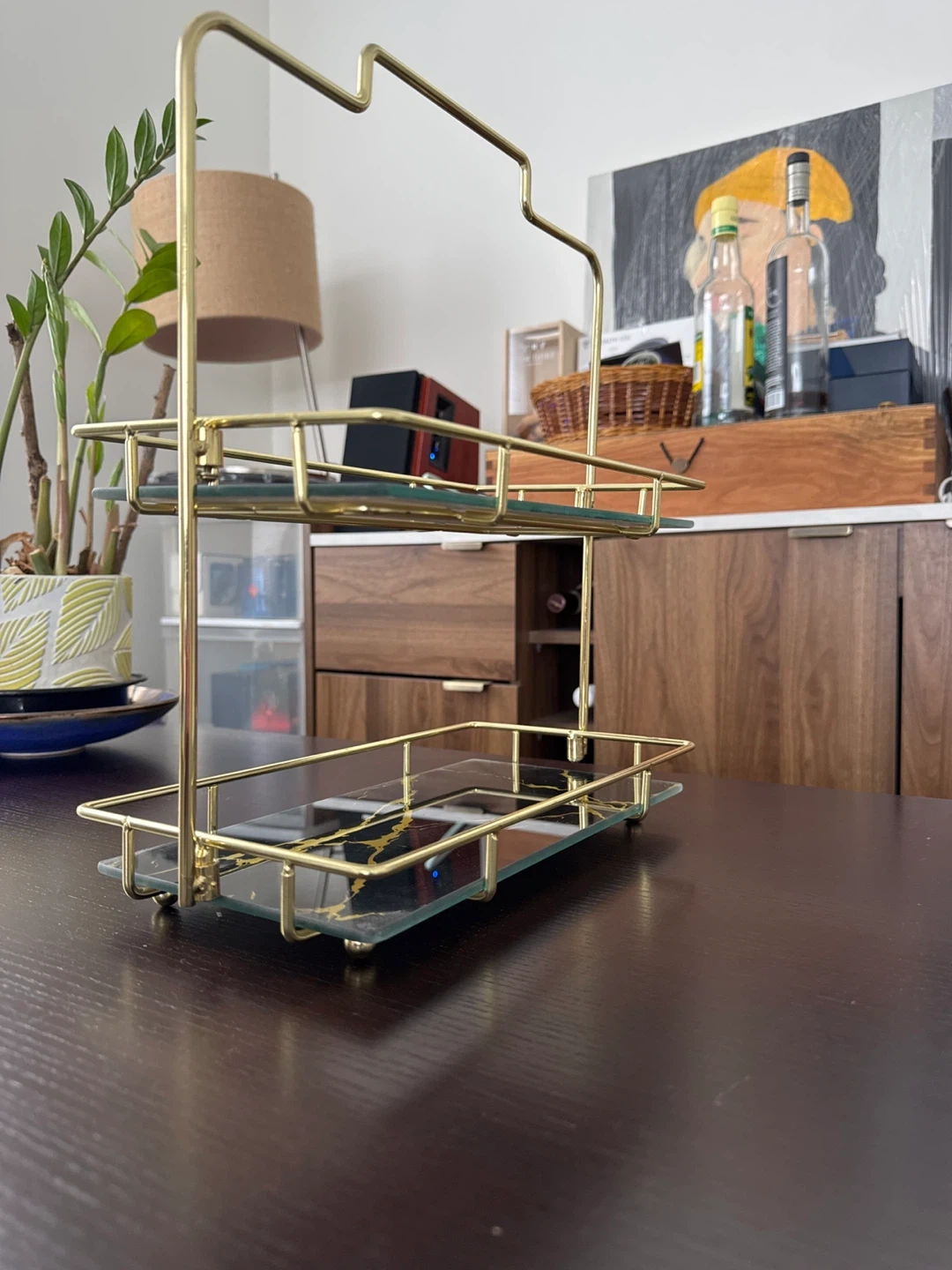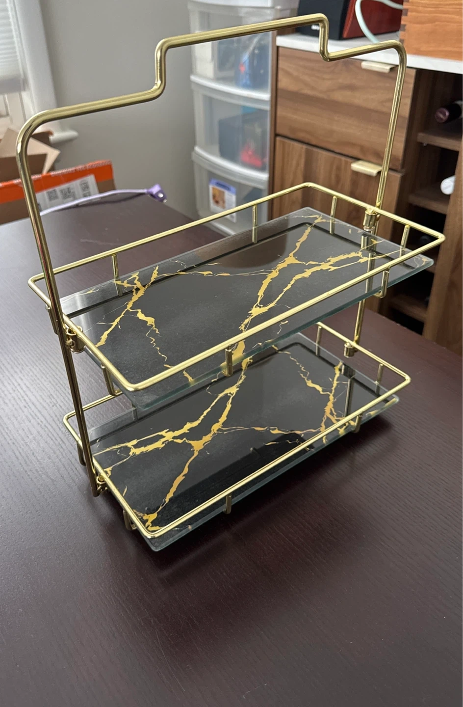 This elegant two-tier tray stand features a gold metal frame with black marble-look shelves. It's perfect for displaying snacks, drinks, or decorative items. The sleek design adds a touch of modern style to any surface!