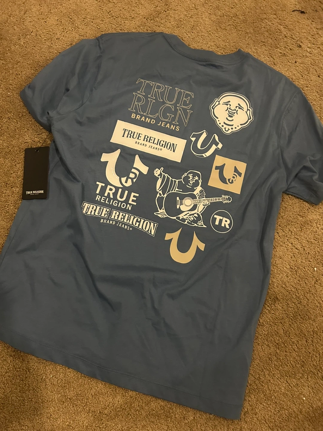 This is a brand new blue True Religion t-shirt. It features multiple brand logos and graphics on the back. Short sleeves and a crew neck. Cotton material.