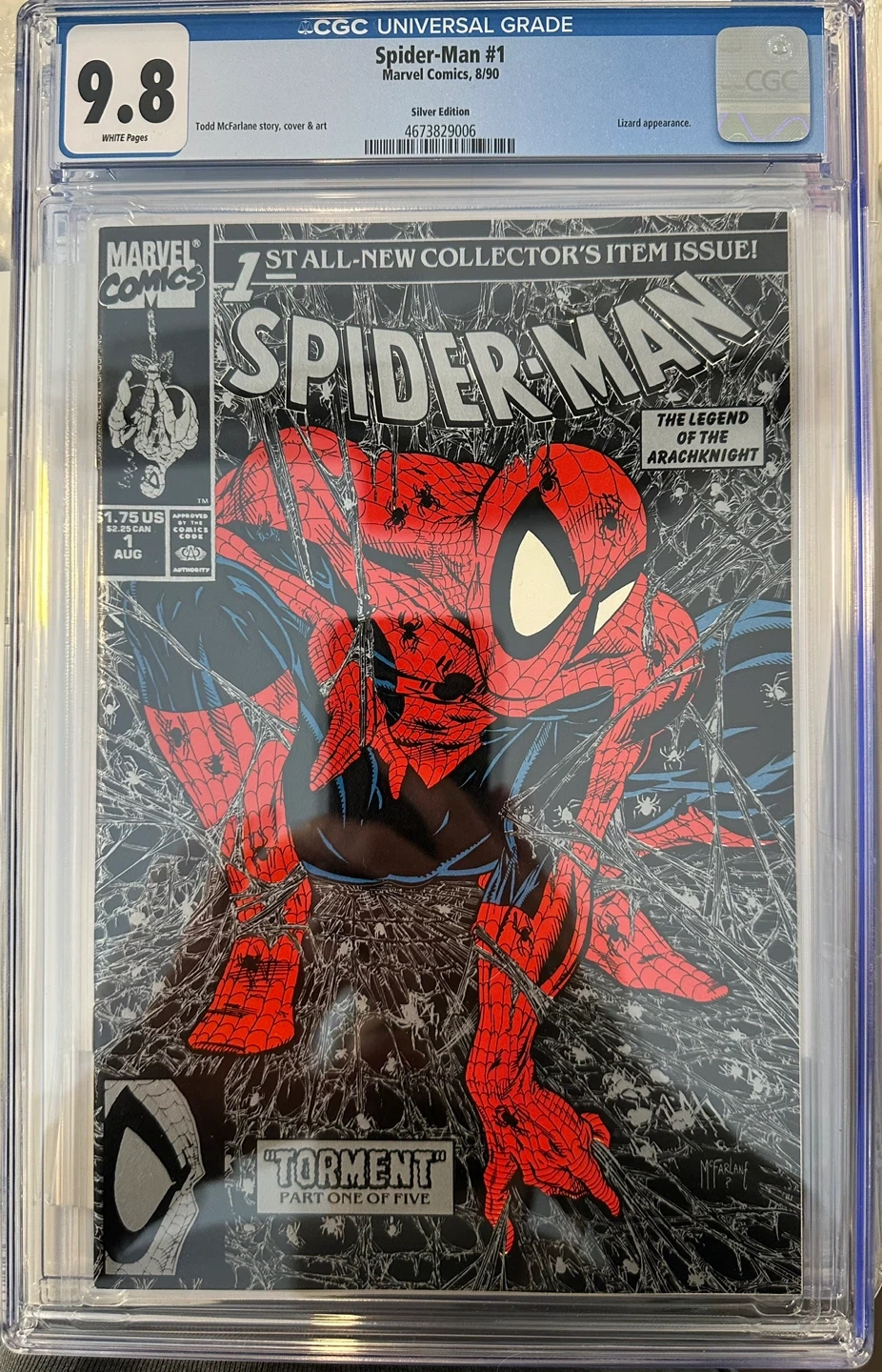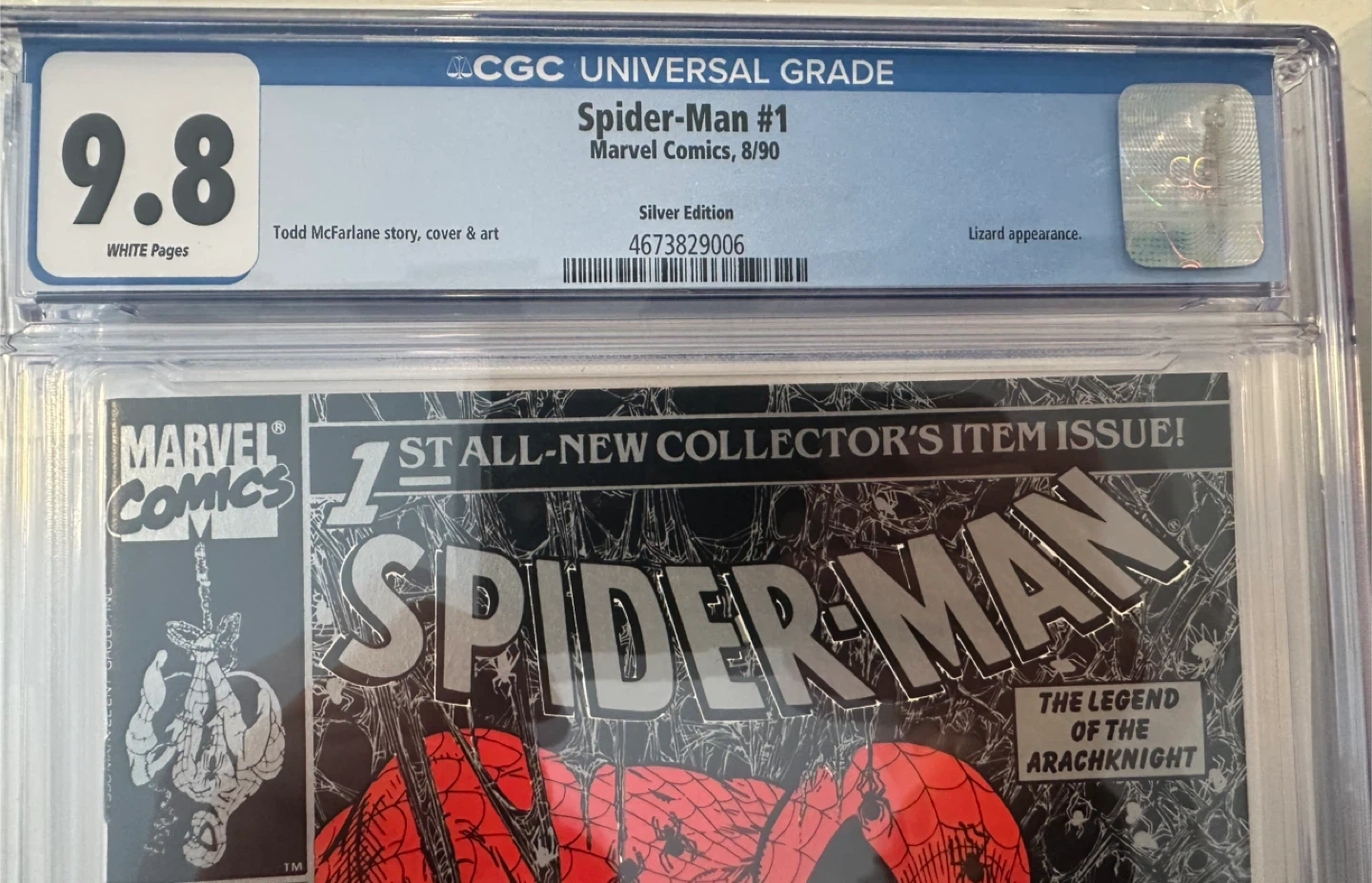 This is a Silver Edition of Spider-Man #1, graded 9.8 by CGC with White Pages. It features "The Legend of the Arachknight" story by Todd McFarlane. This issue is noted as the "1st ALL-NEW COLLECTOR'S ITEM ISSUE!".