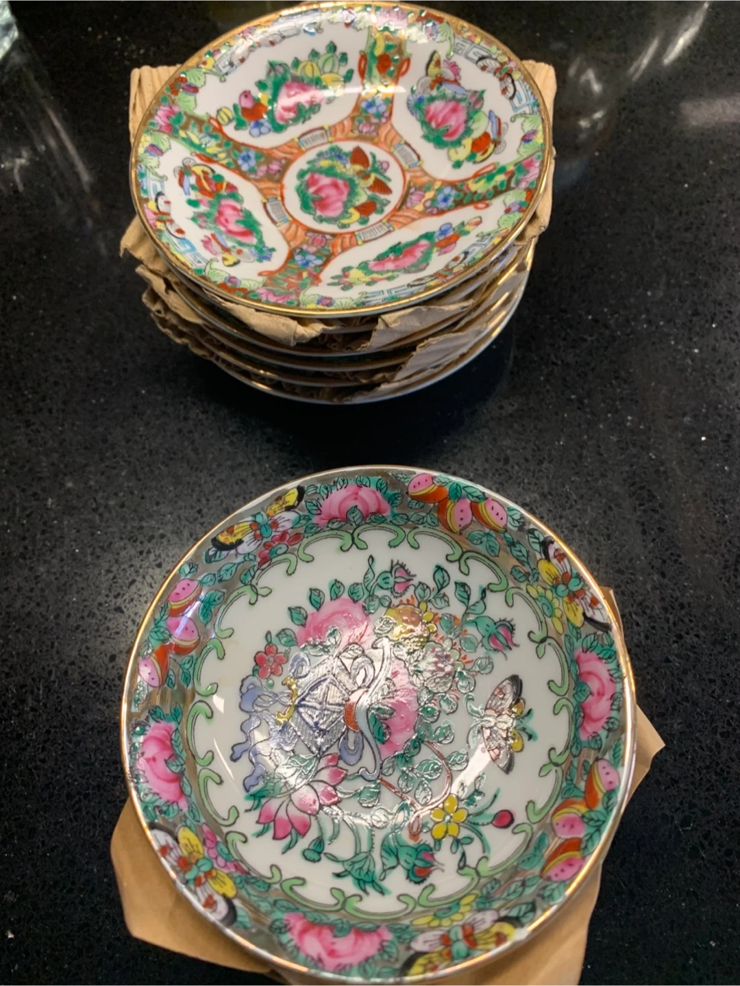 Includes 2 set of 6 saucers featuring the classic Rose Medallion pattern. Hand-painted decoration and gold trim. Made in China. Perfect for serving tea or as decorative pieces.