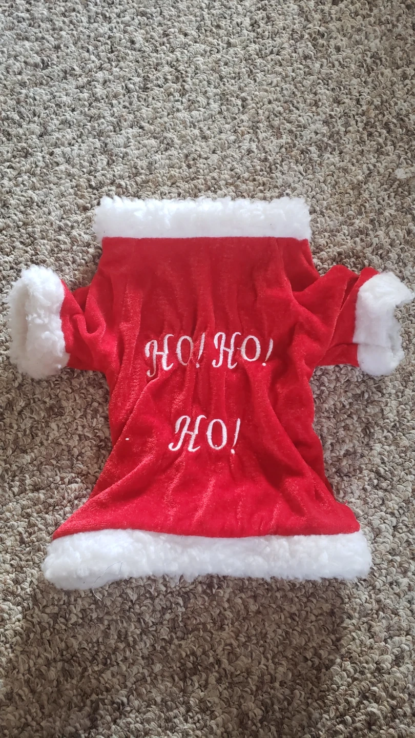Red Santa-style costume with white trim and "HO HO HO!" embroidered on the back. It's made of soft fabric for your pet's comfort. Perfect for festive holiday photos or events!
