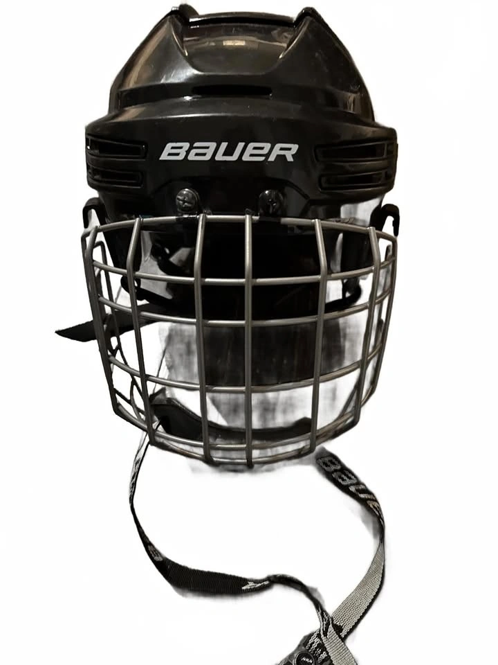 Bauer ice hockey helmet in black featuring a sturdy cage face mask for full facial protection. Adjustable straps ensure a secure fit. Interior padding provides comfort and impact absorption. Size Medium (54.5-59 cm).