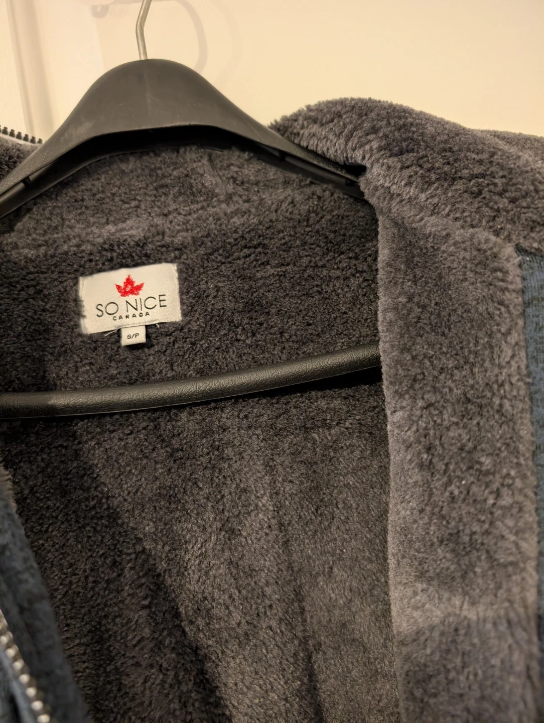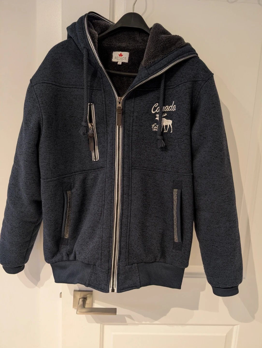 This So Nice Canada zip-up hoodie is navy blue and features a cozy fleece lining. It's a size S/P. The hoodie has "Canada Est. 1972" embroidered on the front with a moose graphic. It's perfect for cooler weather!