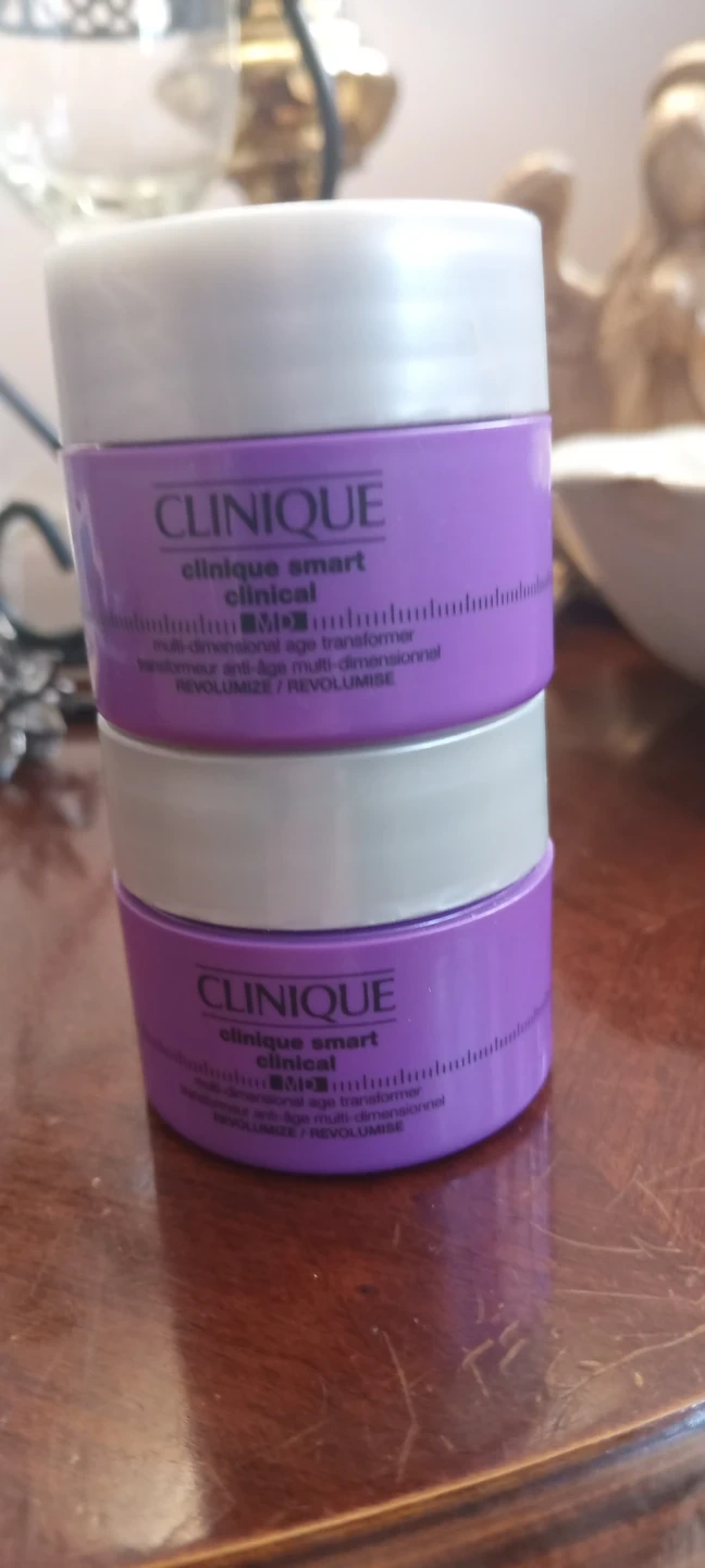 This is a Clinique Smart Clinical Multi-Dimensional Age Transformer cream. It comes in a purple jar and targets multi-dimensional anti-aging. It's suitable for anyone looking to transform their skin's appearance.