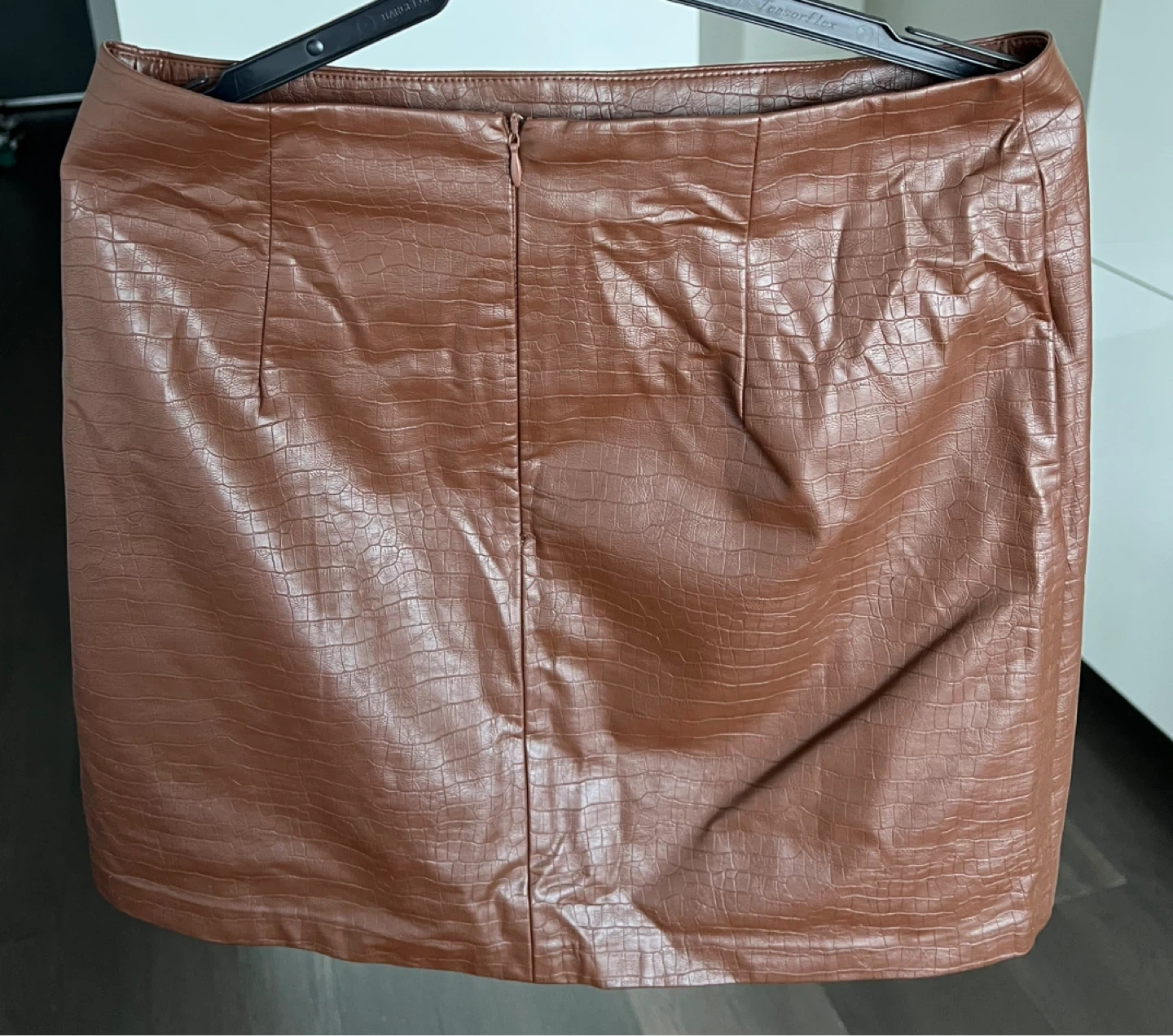 Crocodile-embossed faux leather mini skirt. Brown colour. Features a side slit. Great condition - never worn