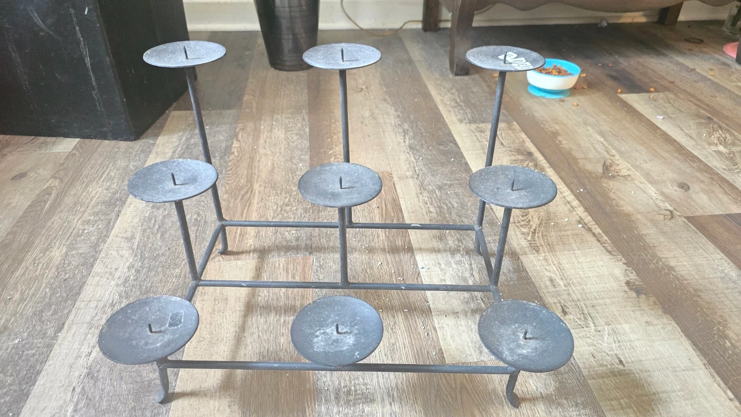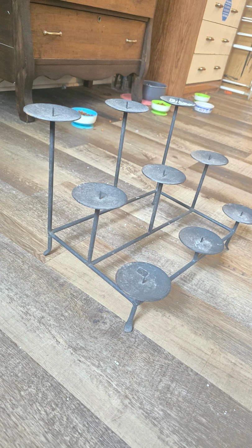 This metal stand holds up to 9 taper candles. It's made of dark grey metal and has a tiered design. Perfect for creating a warm ambiance on a table or mantelpiece!