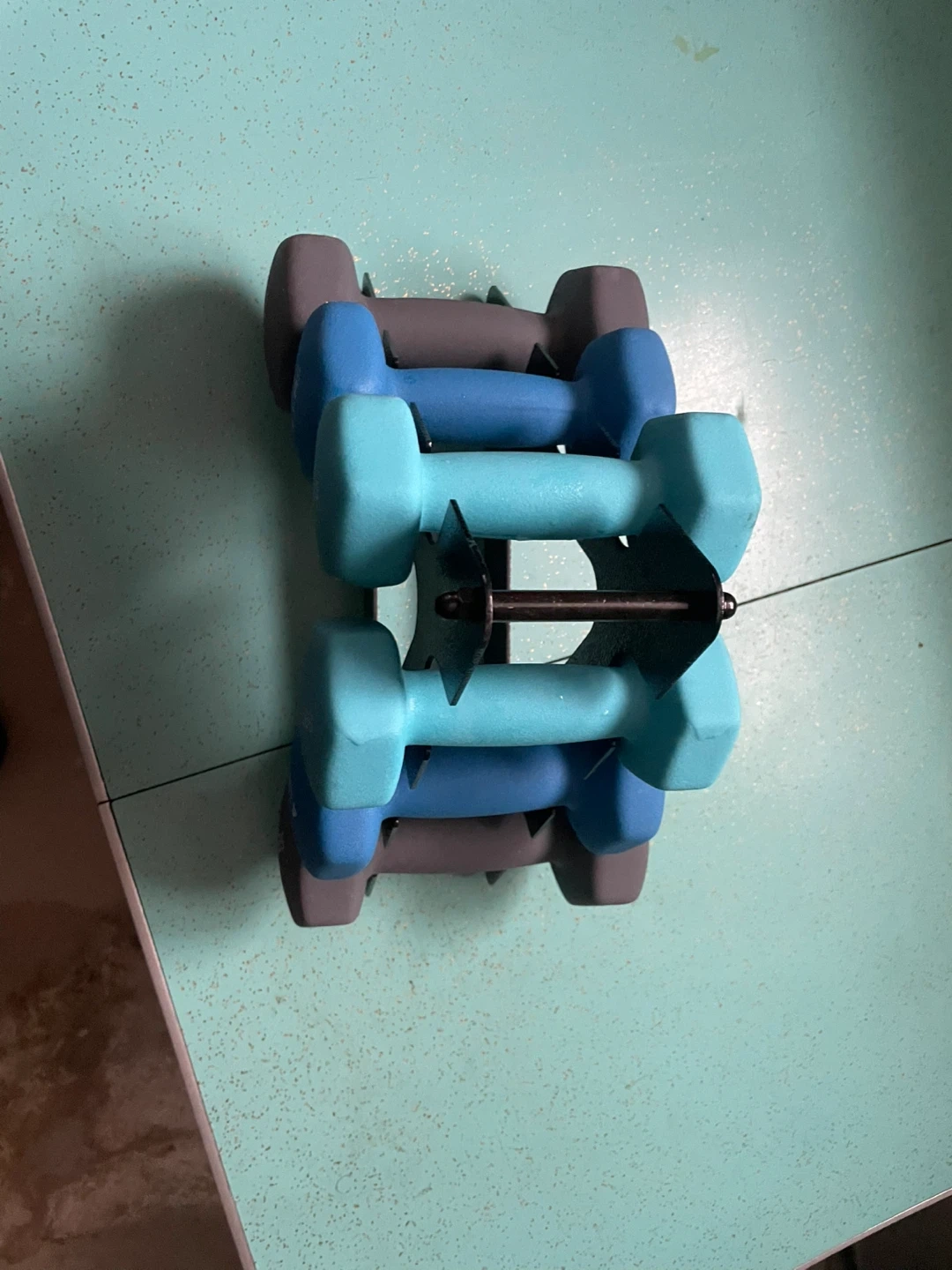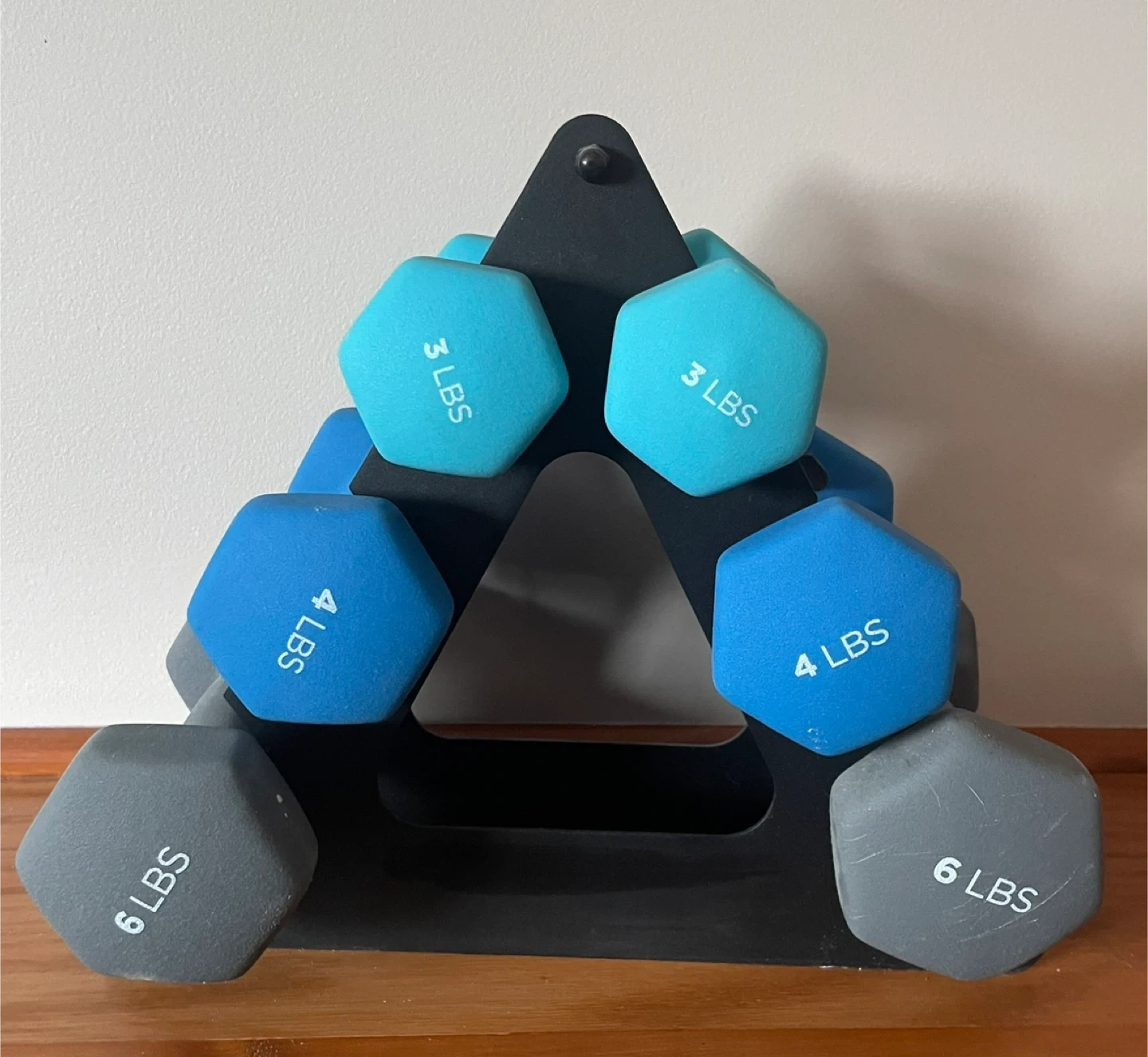 This set includes 3 pairs of dumbbells in varying weights. You'll get two 3 lbs, two 4 lbs, and two 6 lbs weights. They come with a convenient triangle rack for storage. It's a great starter set for home workouts!