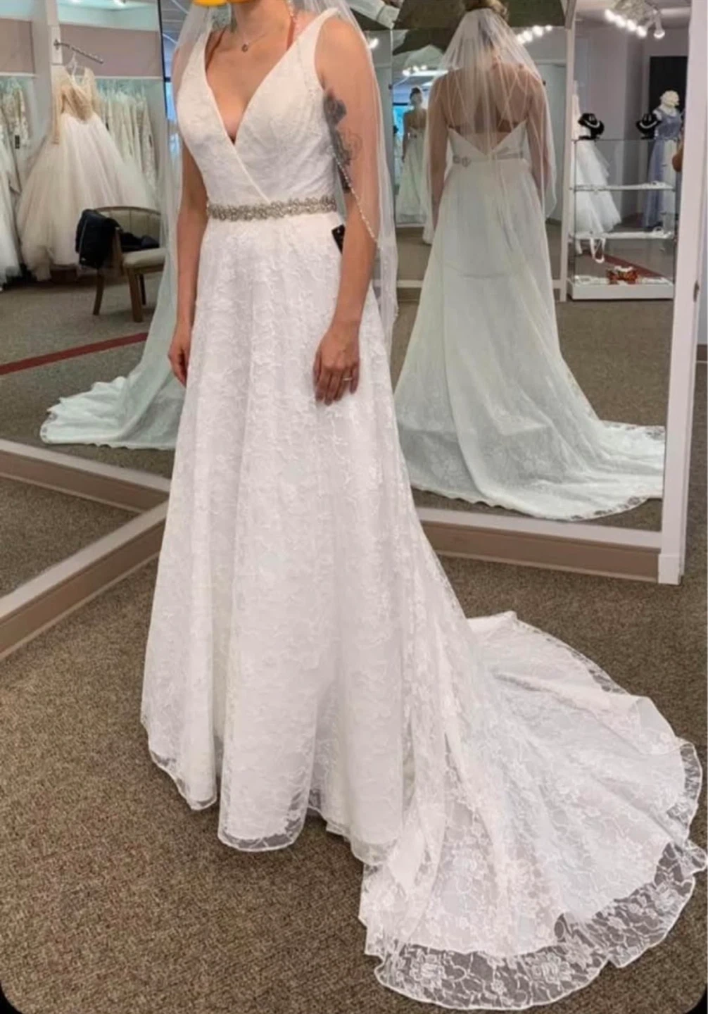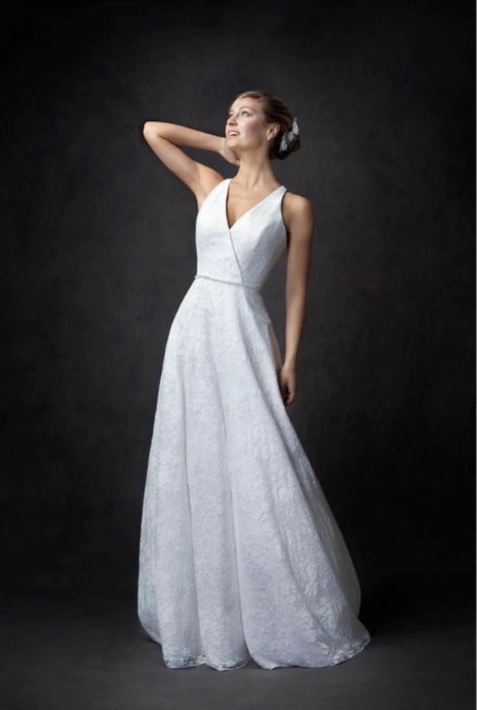 Beautiful white lace wedding dress with a deep V-neckline and a delicate beaded belt accent. It features a flattering A-line silhouette and a sweeping train. Perfect for your special day!