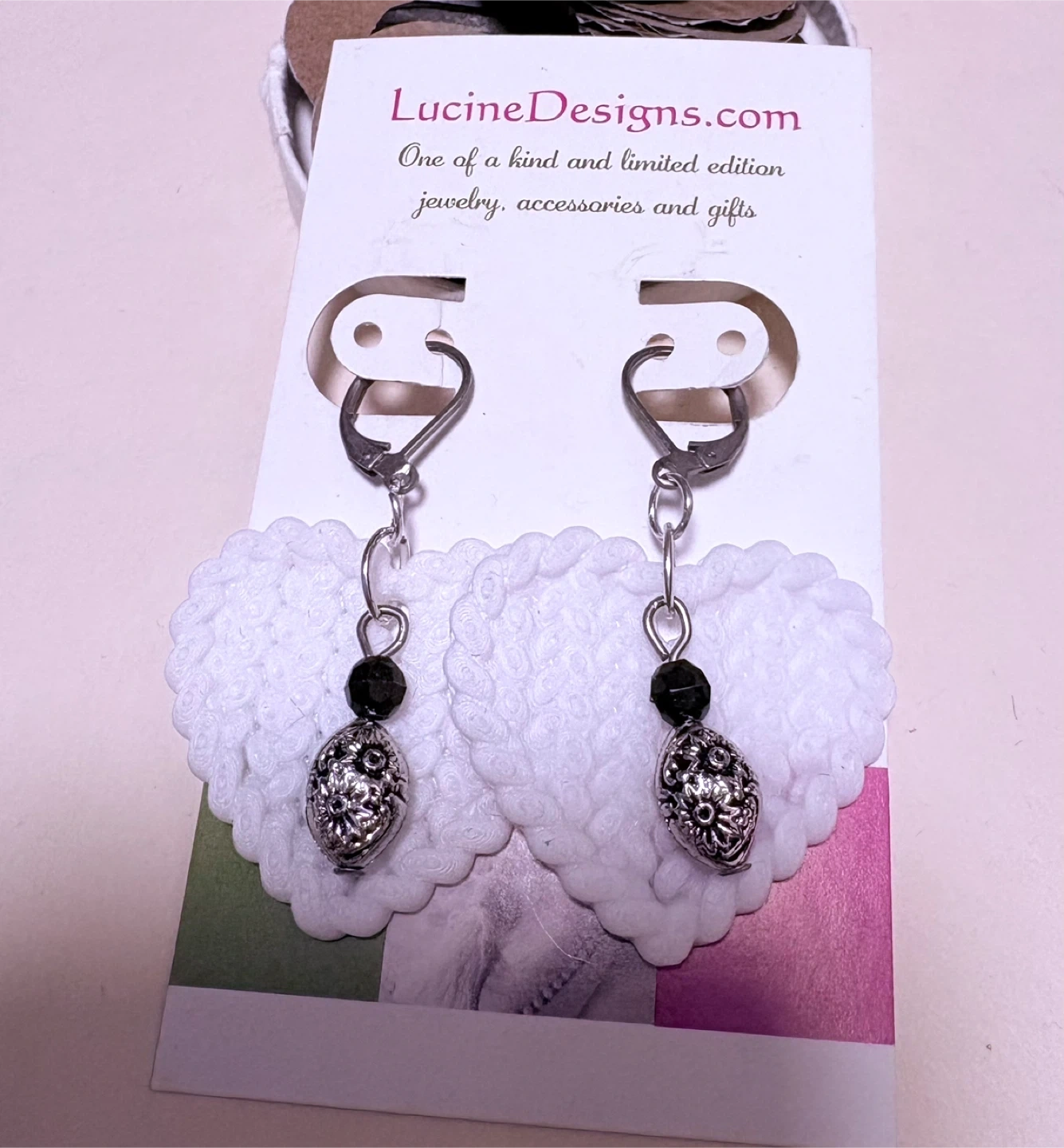 These dangle earrings feature white heart-shaped charms with silver-tone accents. Each earring has a black bead above a decorative silver charm. They're secured with leverback ear wires.