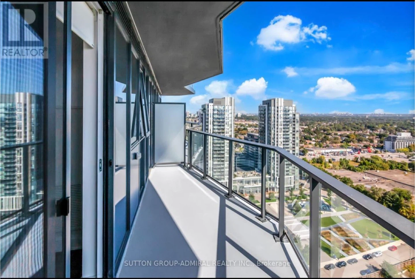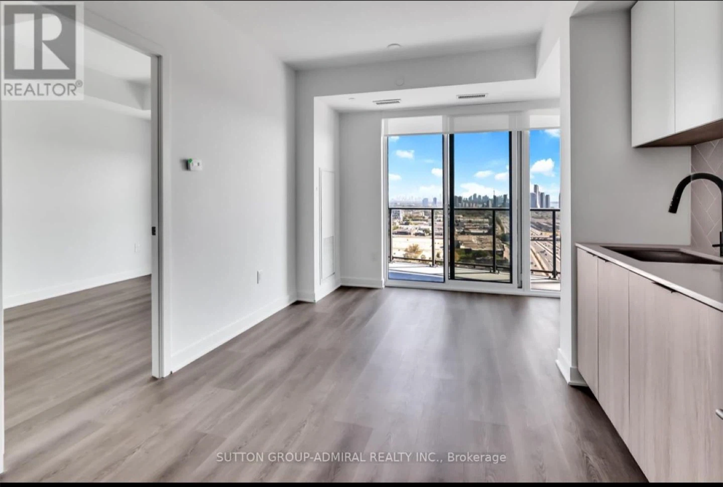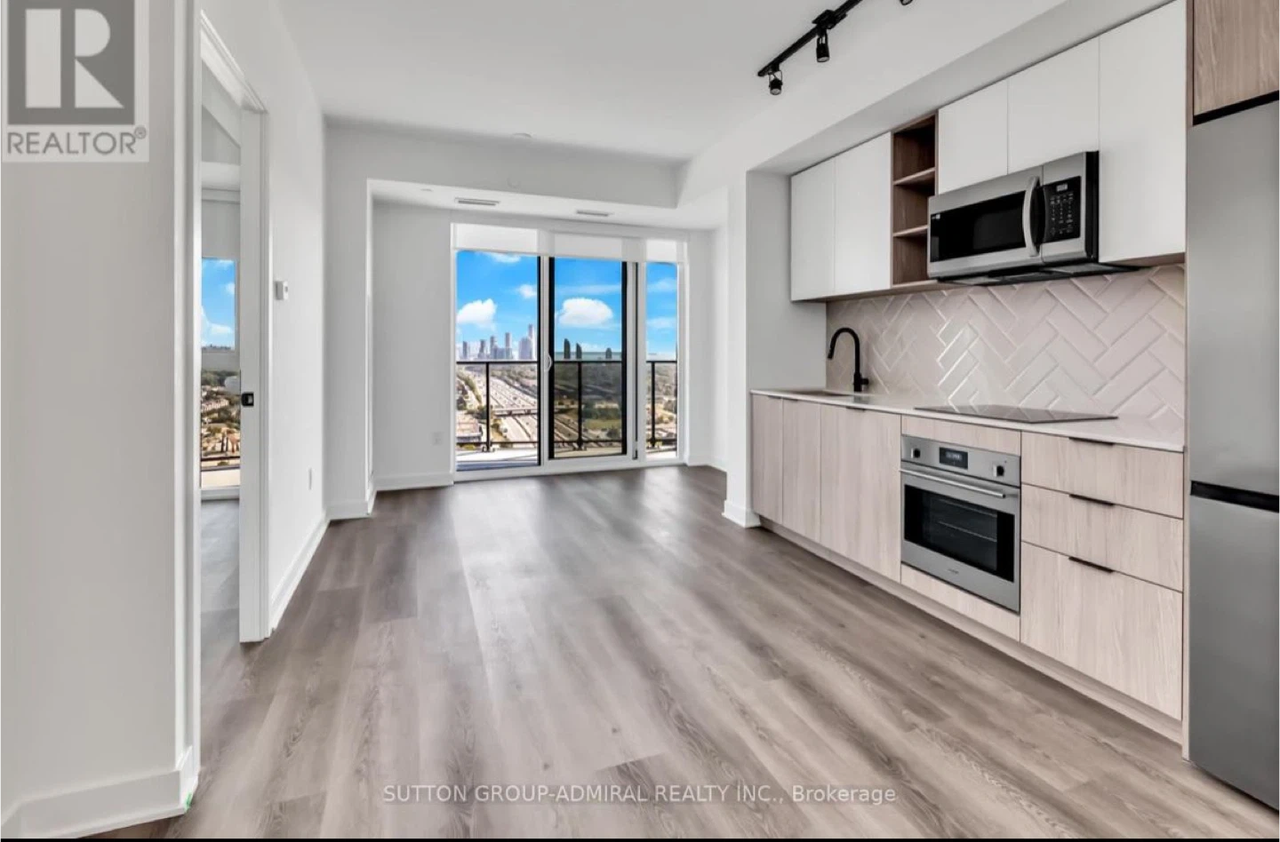 Bright and spacious condo unit featuring a modern kitchen and a private balcony with city views. Beautiful 23rd Floor Condo Unit for Rent 2 Bedroom + Den with 1 Bath - 700 Sq Ft. Located near Evans Ave + Horner Ave. without In-suite laundry (stacked washer/Dryer)
