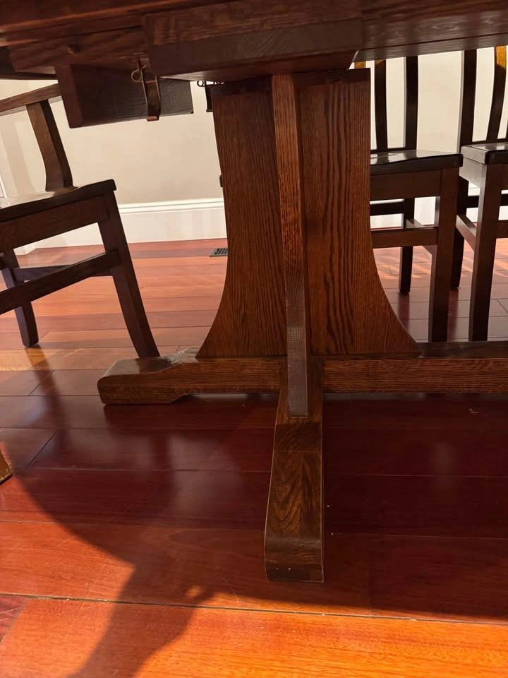 Has an authentic dual trestle base and four leaves (expertly hidden underneath the table) that can expand the table from 48"- up to 116”, in length. Yes that's almost ten feet long fully extended!