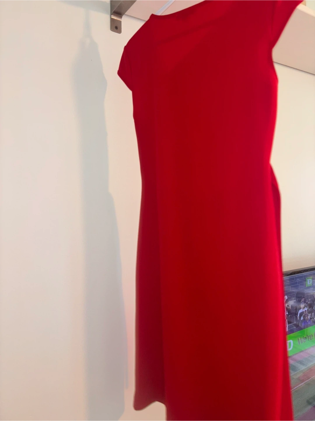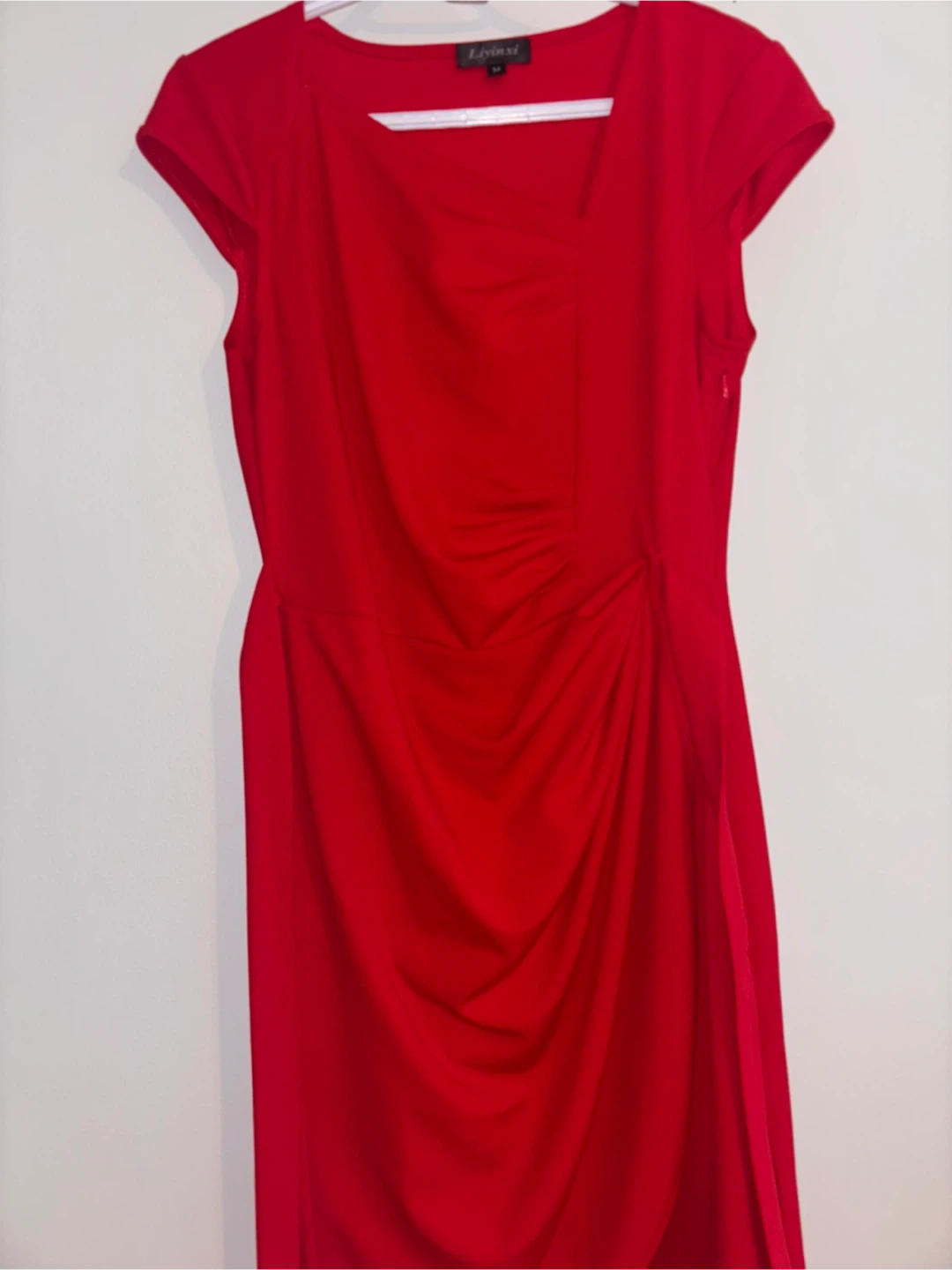 A stylish red dress with cap sleeves and flattering ruching detail that enhances your shape beautifully. Perfect for a night out, dinner, or any special occasion. The fabric is soft and drapes very nicely for a comfortable and elegant fit.