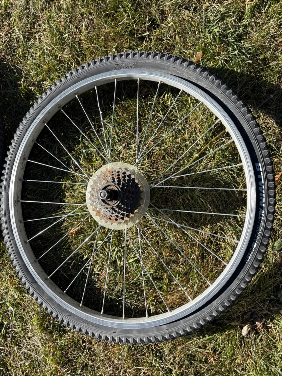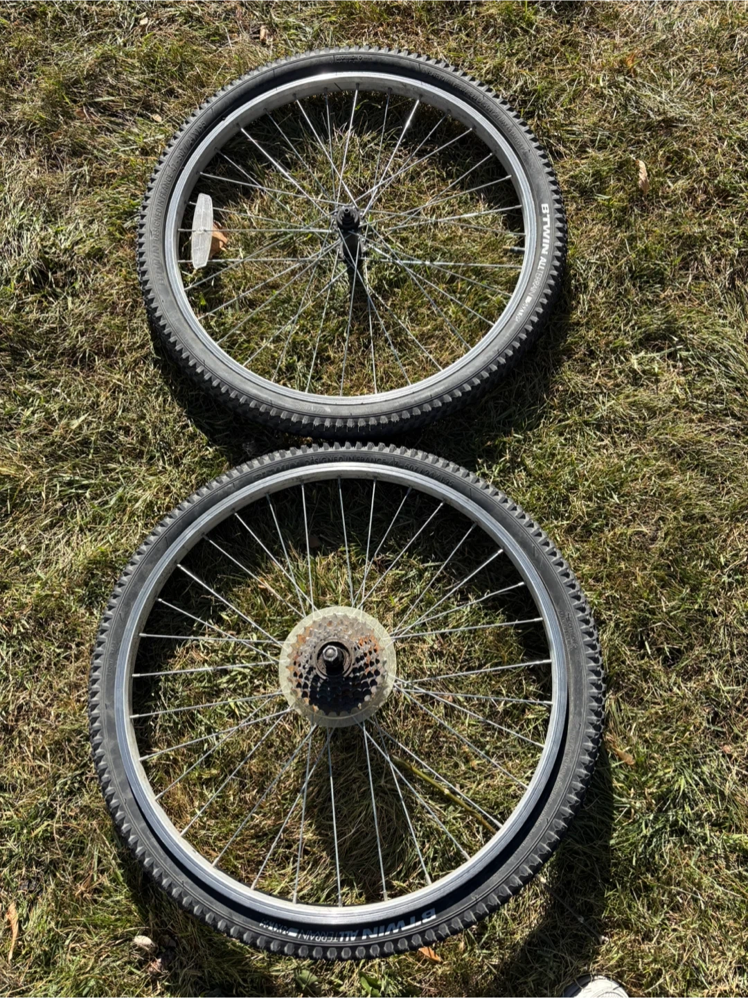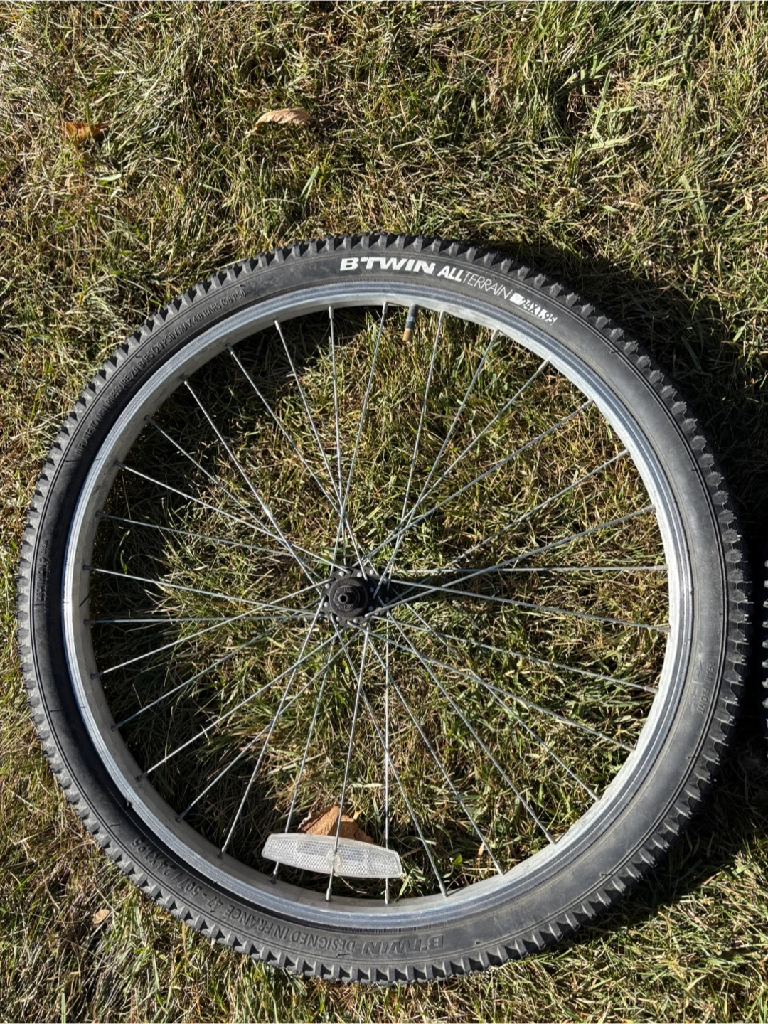 Selling a pair of Btwin All Terrain bike wheels. They show some signs of use, as you can see in the photos, but are still in good working condition. Great for your next biking adventure! The front wheel and tire is good , selling for 10$ , the back wheel lost the inner tube , selling for 5$ . They are 24 inches. The tires are in good condition. Pick up at Morley trail NW