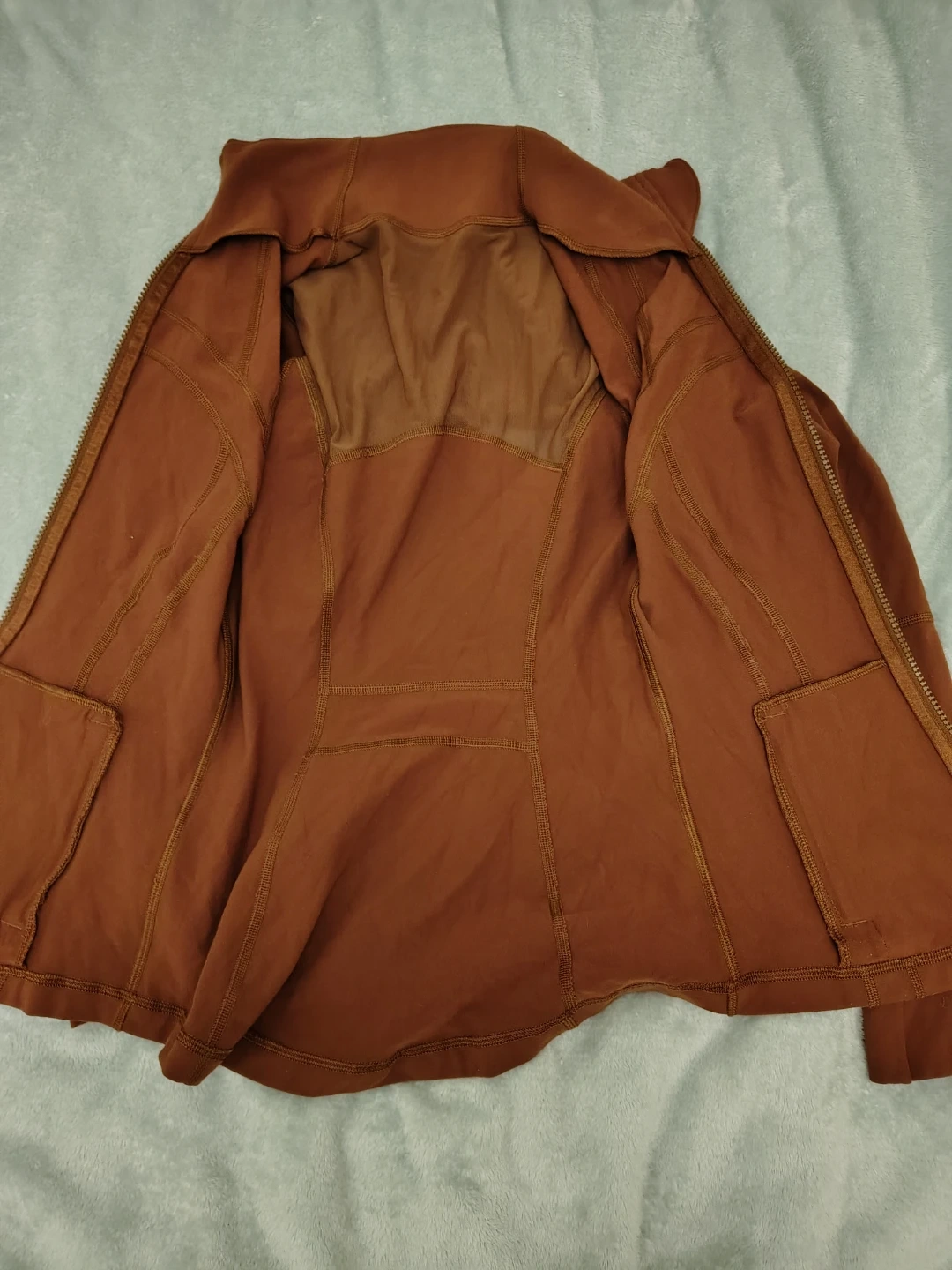 This is a Lululemon Athletica zip-up jacket. It has a full zipper closure and zippered pockets. Thumbholes are present on the cuffs.