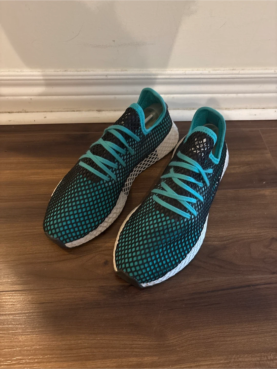 These Adidas Deerupt Runners are a cool teal and black colourway. They feature a mesh upper and a rubber outsole for durability. These kicks are awesome for everyday wear or light workouts!