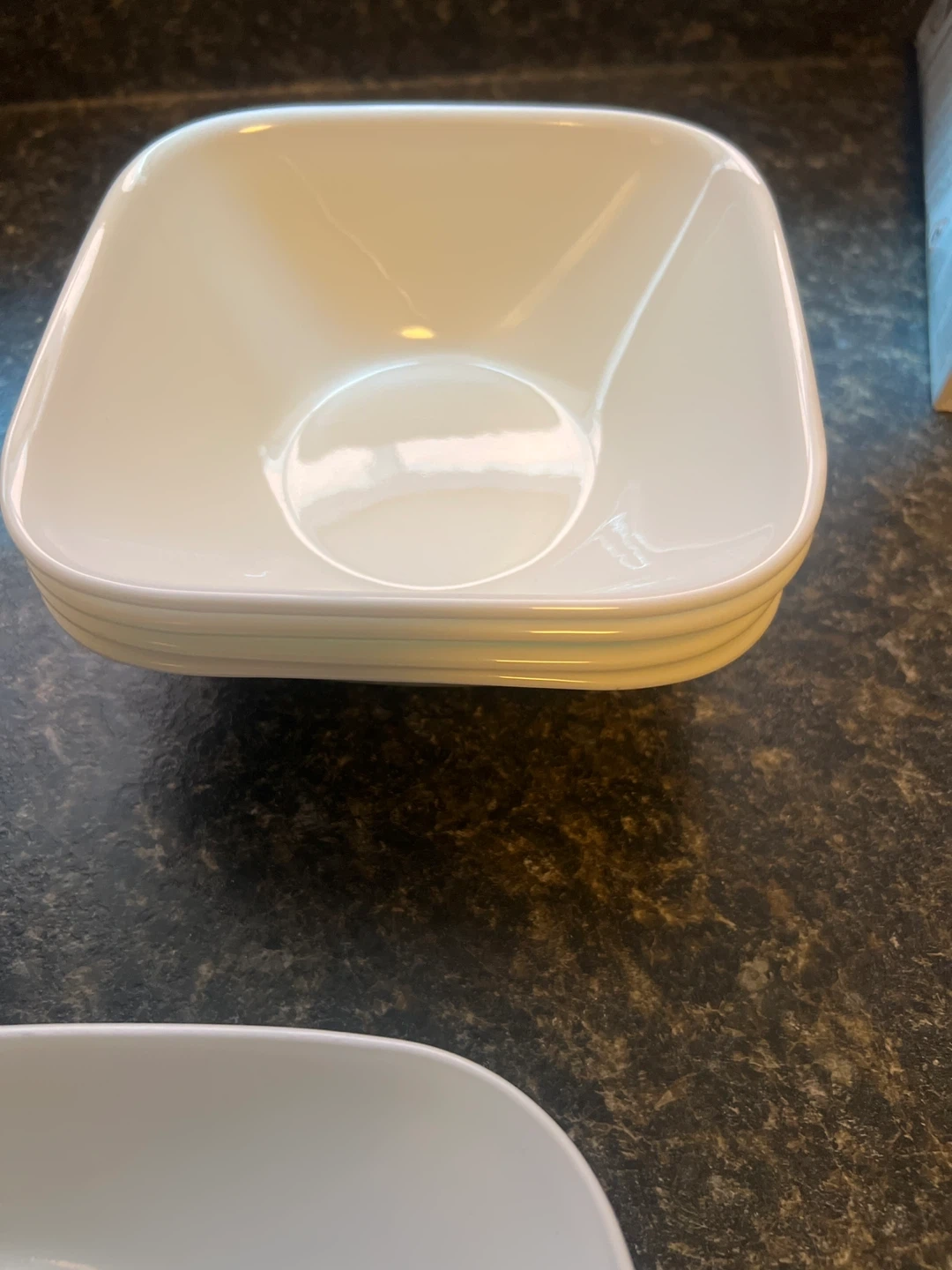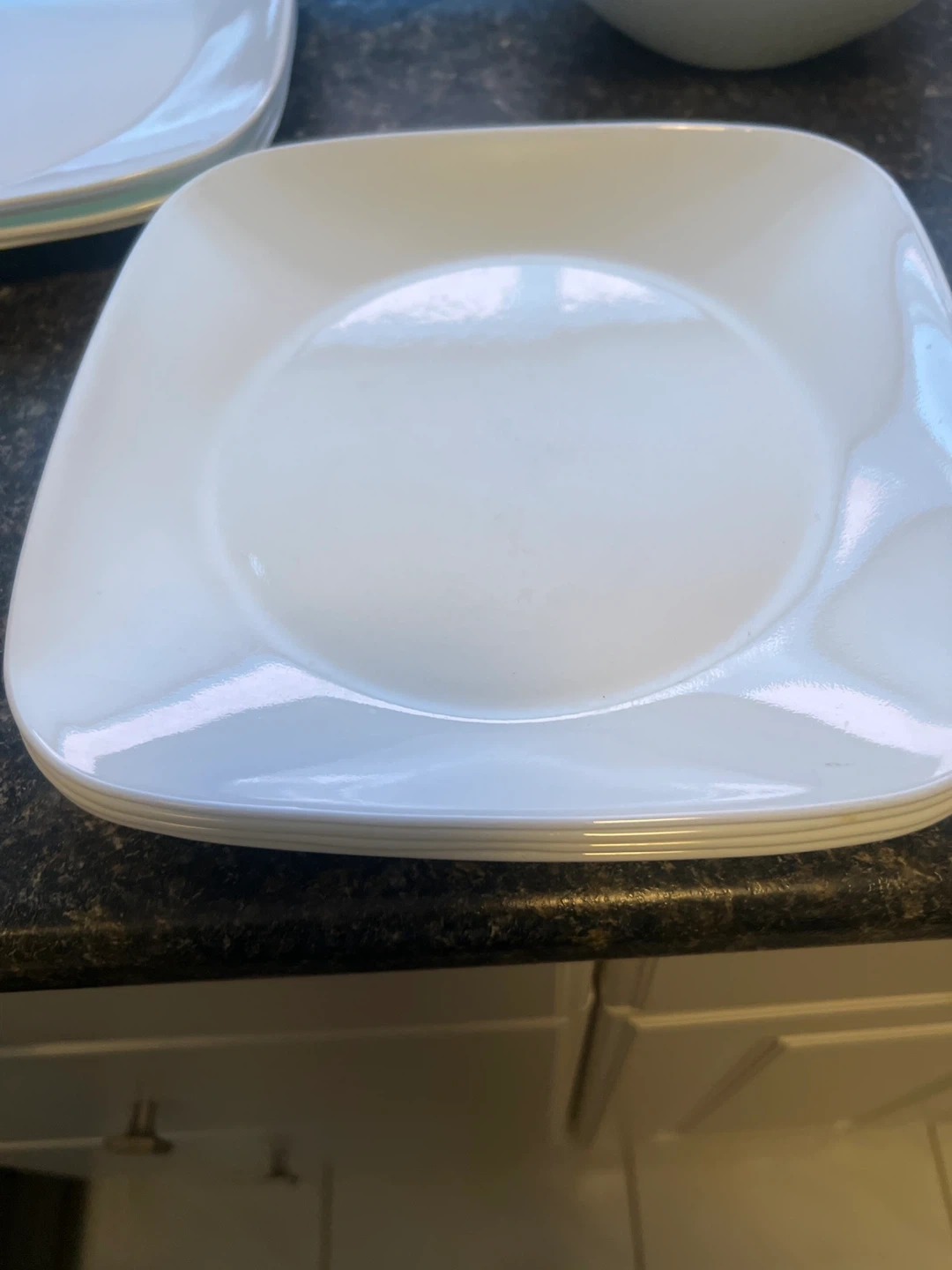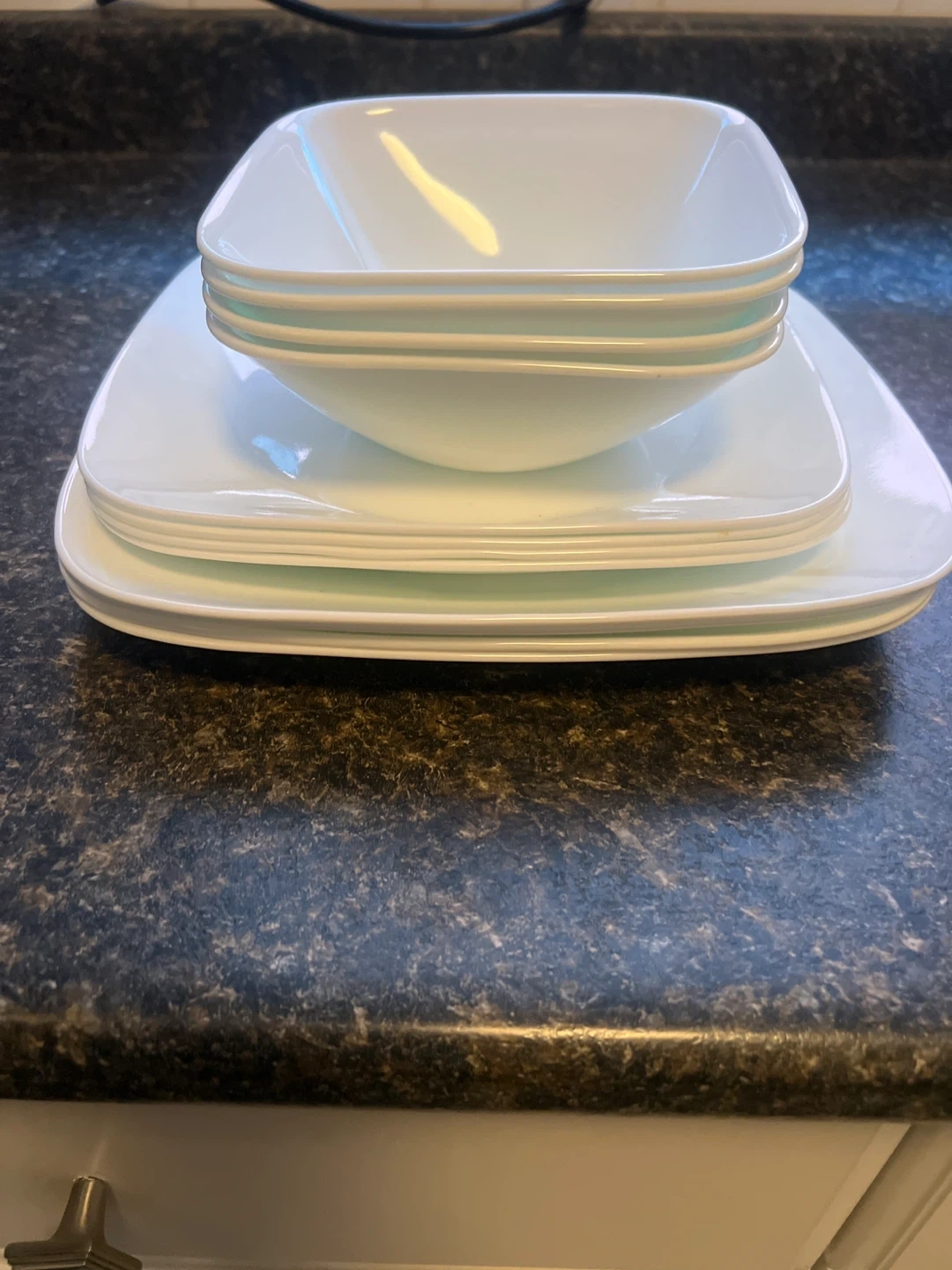 This set includes white square dinner plates and matching bowls. They're made of durable material and are perfect for everyday use. These dishes stack nicely for easy storage.