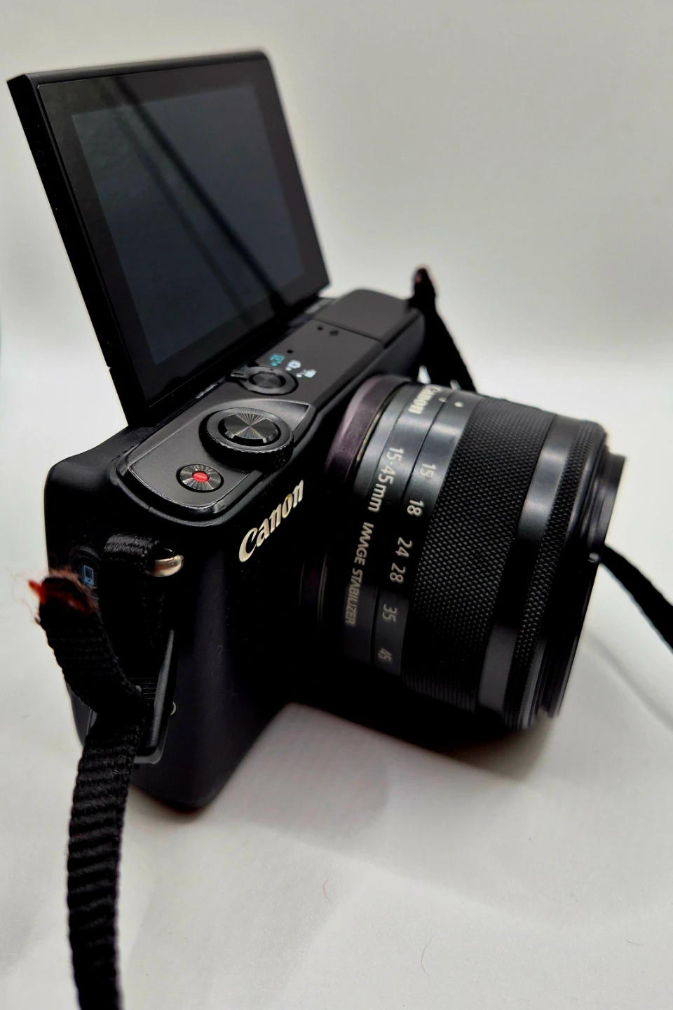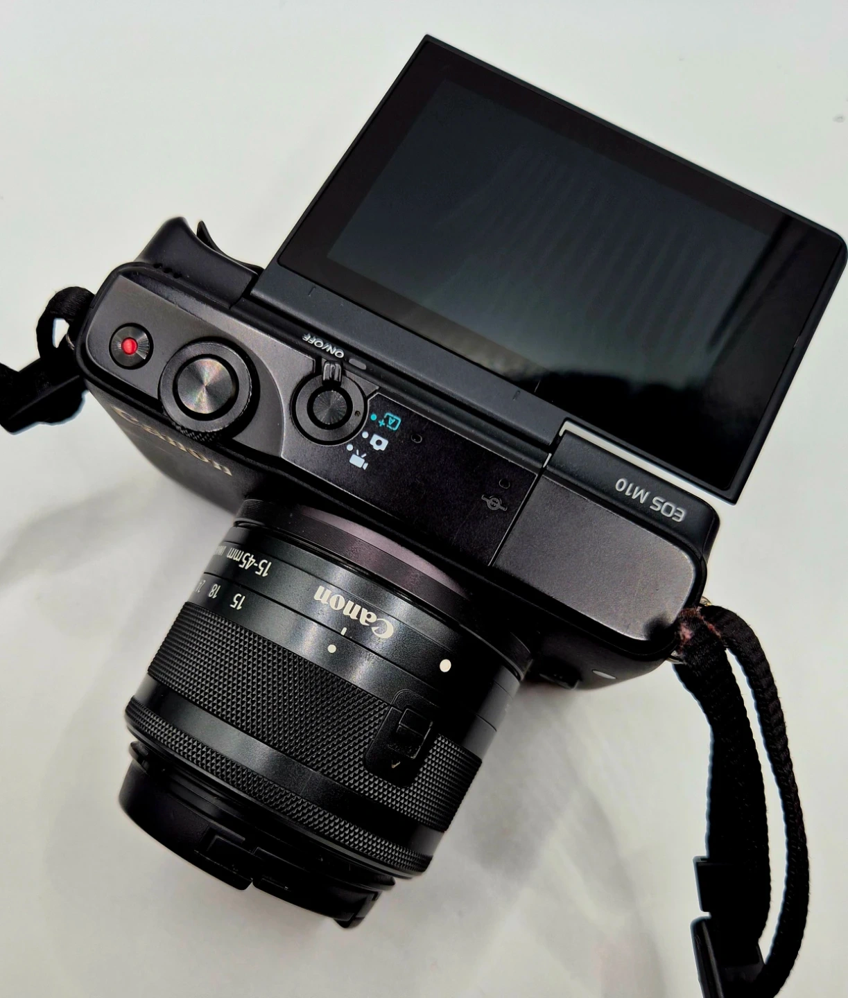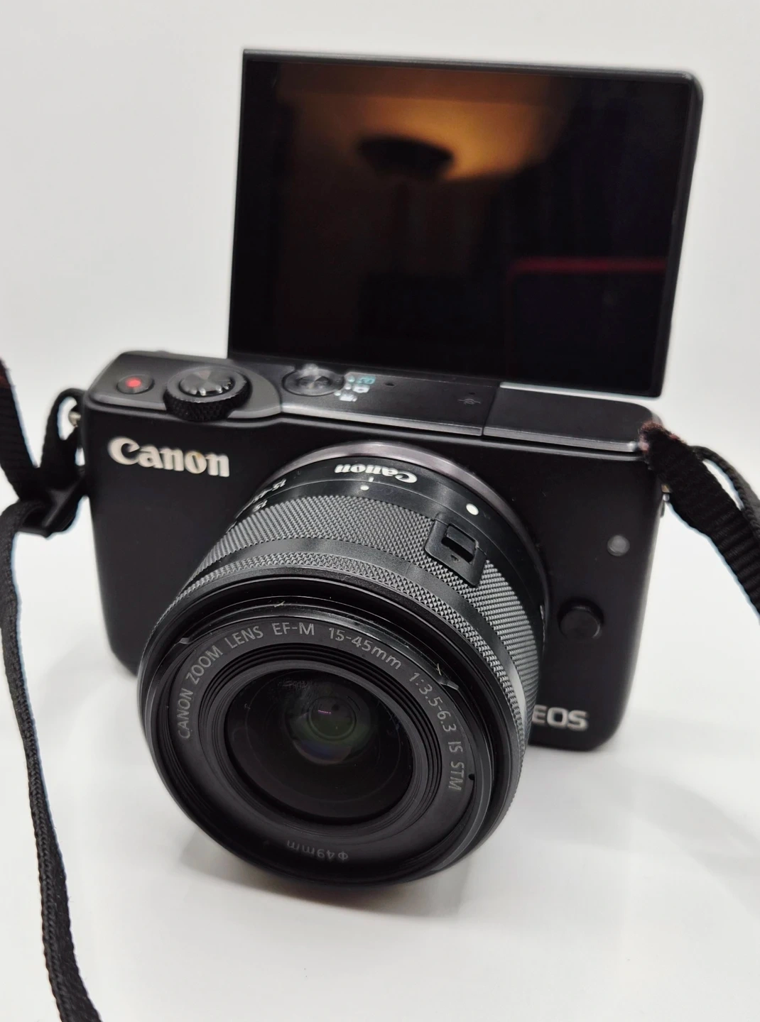 This is a black Canon EOS M10 mirrorless camera. It comes with a Canon ZOOM LENS EF-M 15-45mm 1:3.5-6.3 IS STM. The screen flips up, which is great for selfies and vlogging.