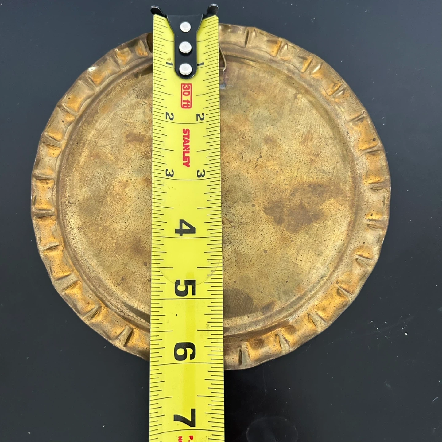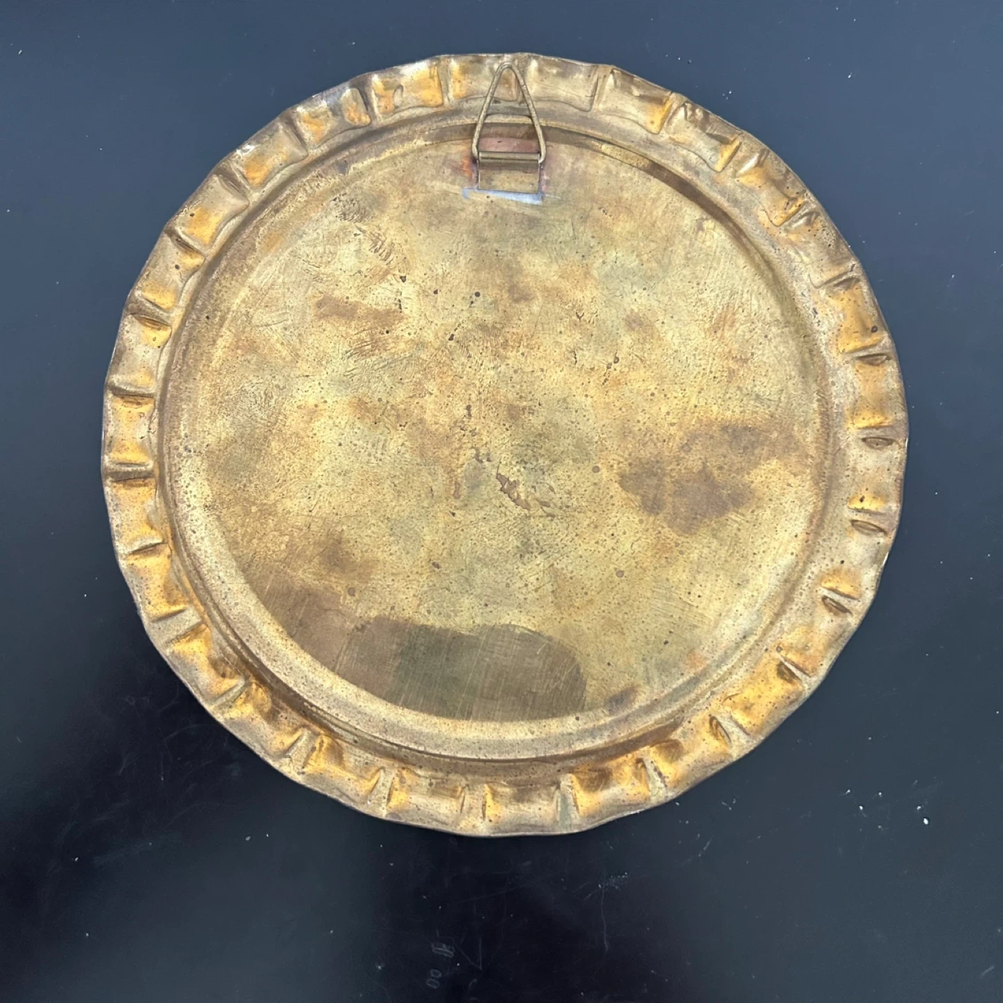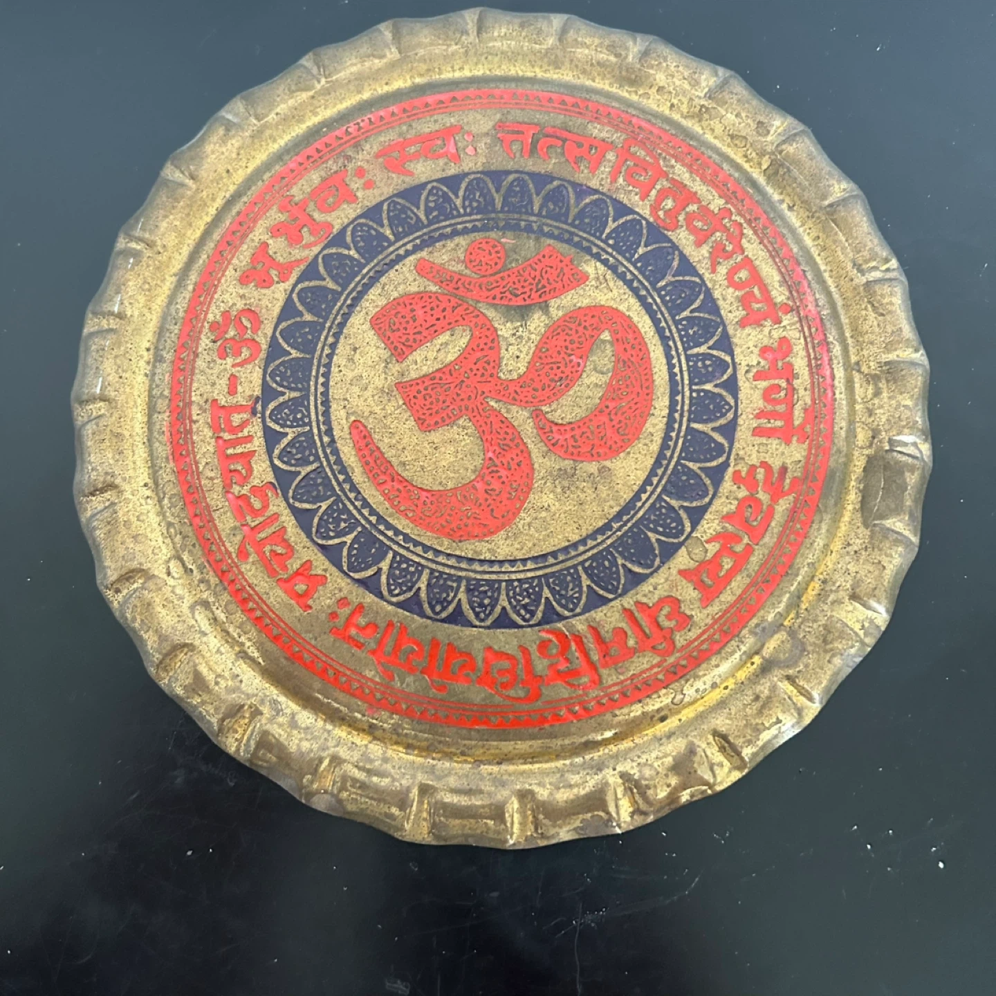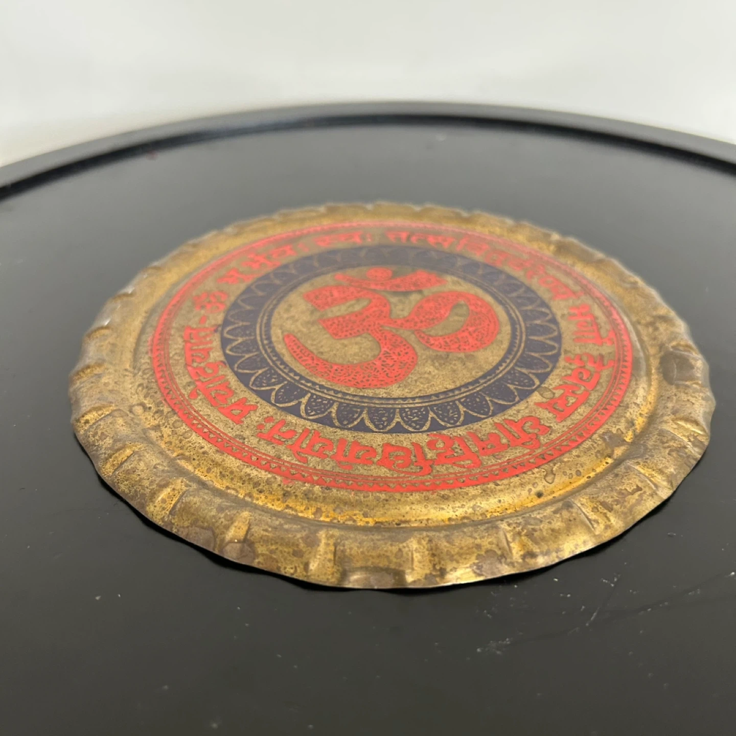 This circular piece has a decorative scalloped edge and a warm, naturally aged patina that enhances its spiritual and collectible character. The contrast of brass with red and black enamel detailing gives it a striking presence, making it ideal for a home altar, meditation corner, yoga studio, or as meaningful wall decor.