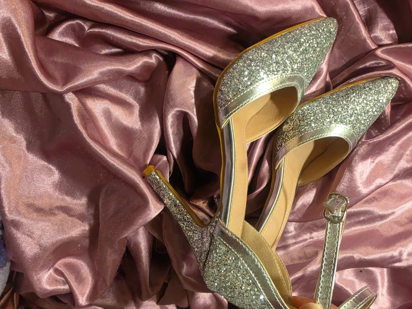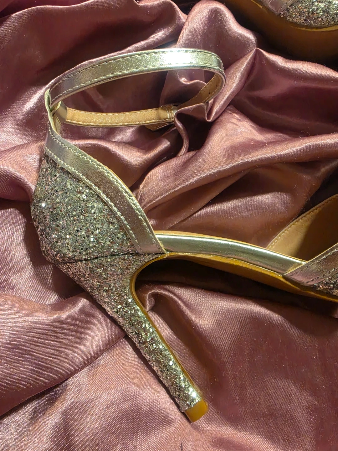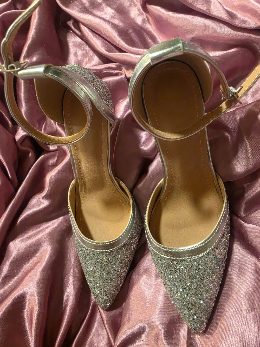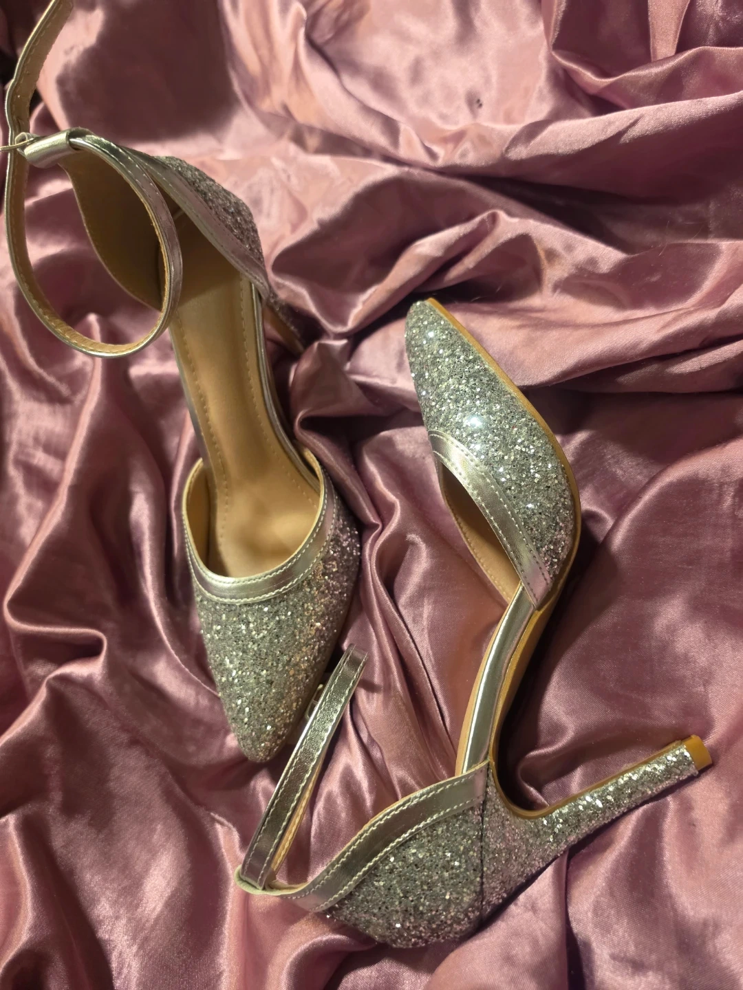 Sparkly silver glitter heels with an ankle strap. They feature a pointed toe and stiletto heel.