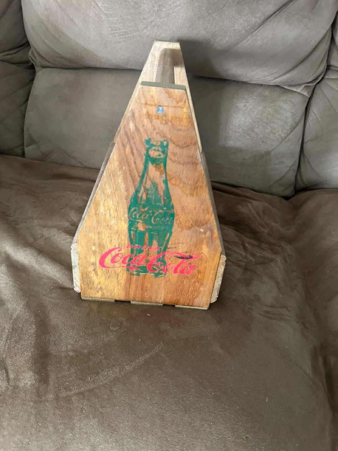This wooden caddy features vintage Coca-Cola branding on one side. The other side is labelled for condiments like vinegar, sugar, mustard, ketchup, and salt & pepper. It's great for picnics or BBQs!