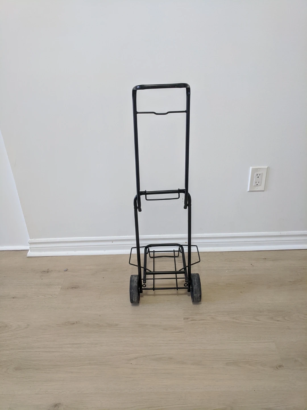 A black folding luggage cart with two wheels. It's great for carrying groceries or travel bags. It folds flat for easy storage. Pick up at 195 Merton Street Toronto or pick up at Subway station Davisivill. And I can deliver it to your house but you need to pay me another $3. Thanks.