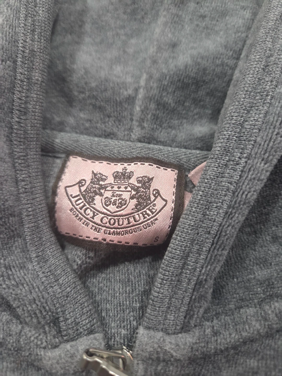 This is a grey Juicy Couture velour zip-up hoodie. It features the iconic Juicy Couture crest logo with rhinestones on the back. Size is small.