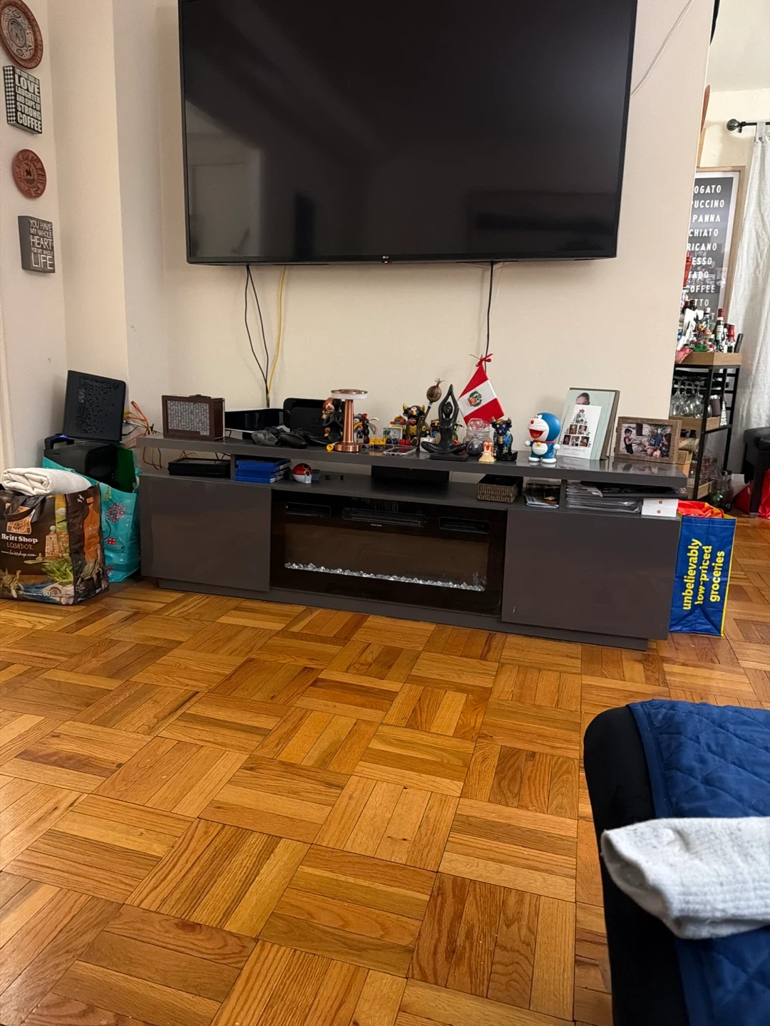 This TV stand features a built-in electric fireplace. It has a dark gray finish and offers ample storage space. The stand is designed to hold a flat-screen television.