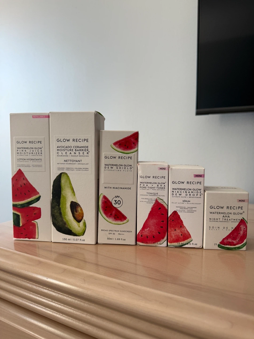 This set includes a Watermelon Glow Pink Juice Moisturizer, Avocado Ceramide Moisture Barrier Cleanser, and mini sizes of Pore-Tight Toner, Dew Drops, and AHA Night Treatment. Also includes a Watermelon Glow Dew Shield Hydrating Fluid SPF 30. Great for hydration and glowy skin!