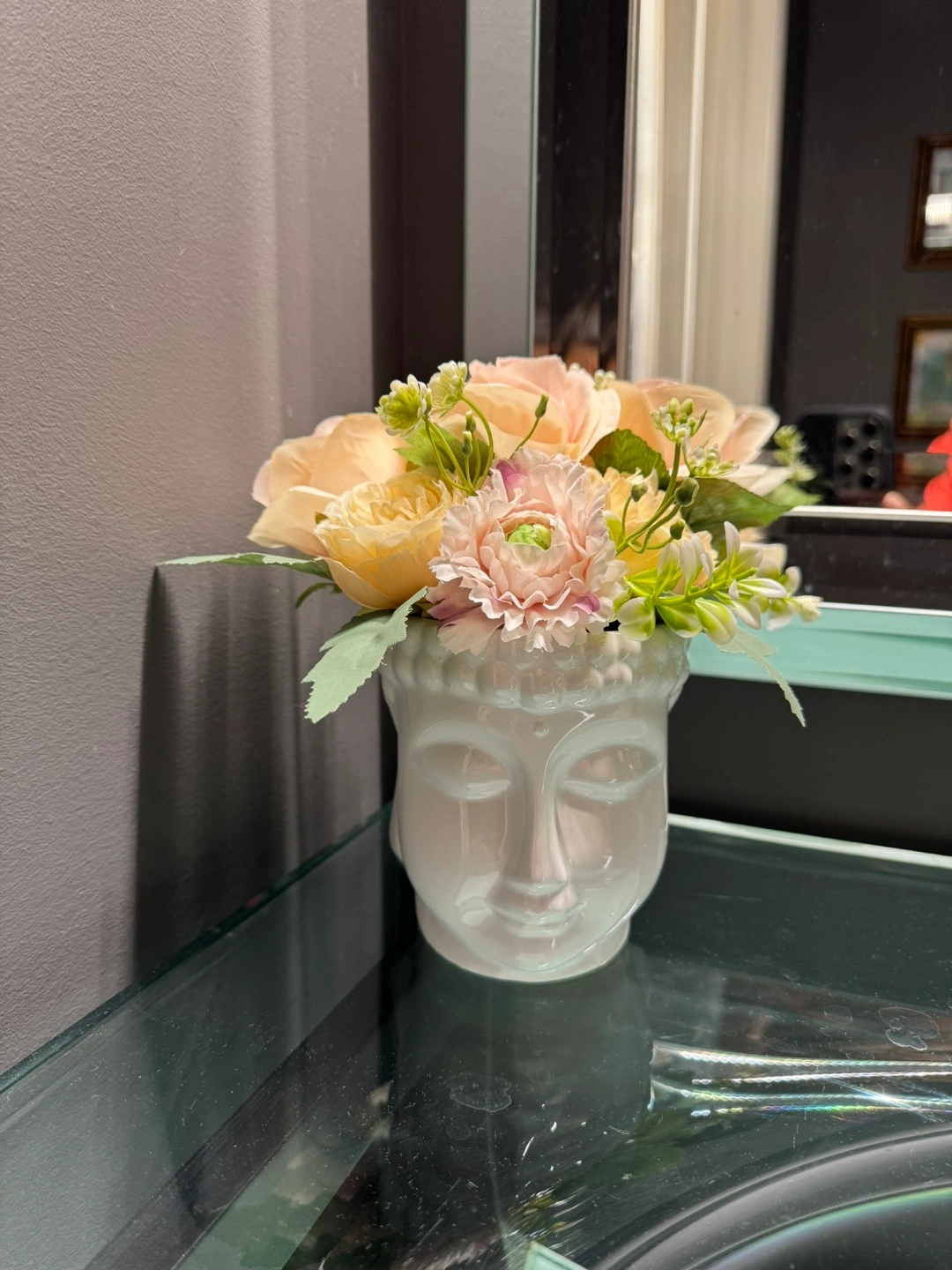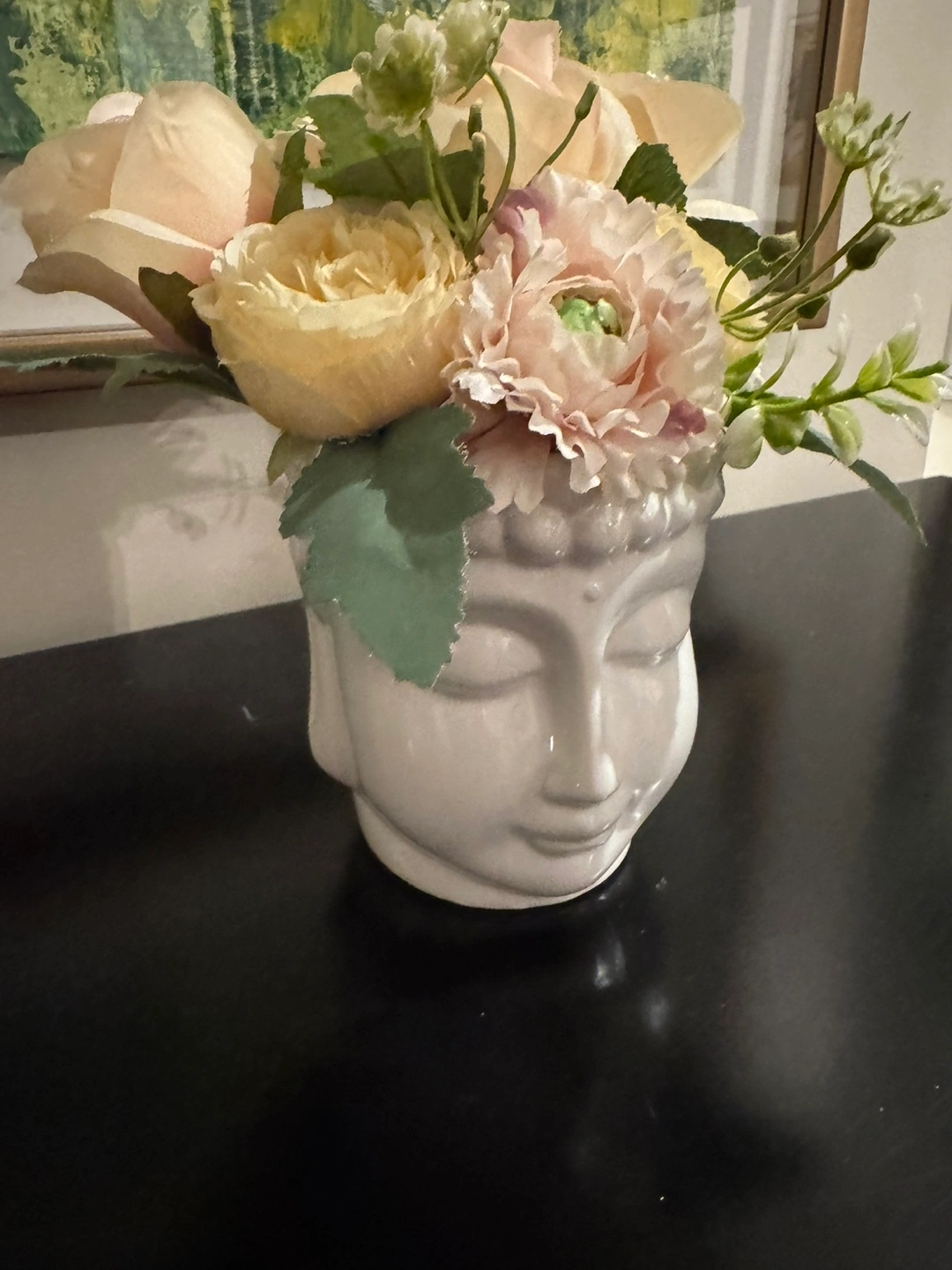 Unique ceramic Buddha head planter. Contains artificial flowers, peach and cream colours. Lovely home decor accent.