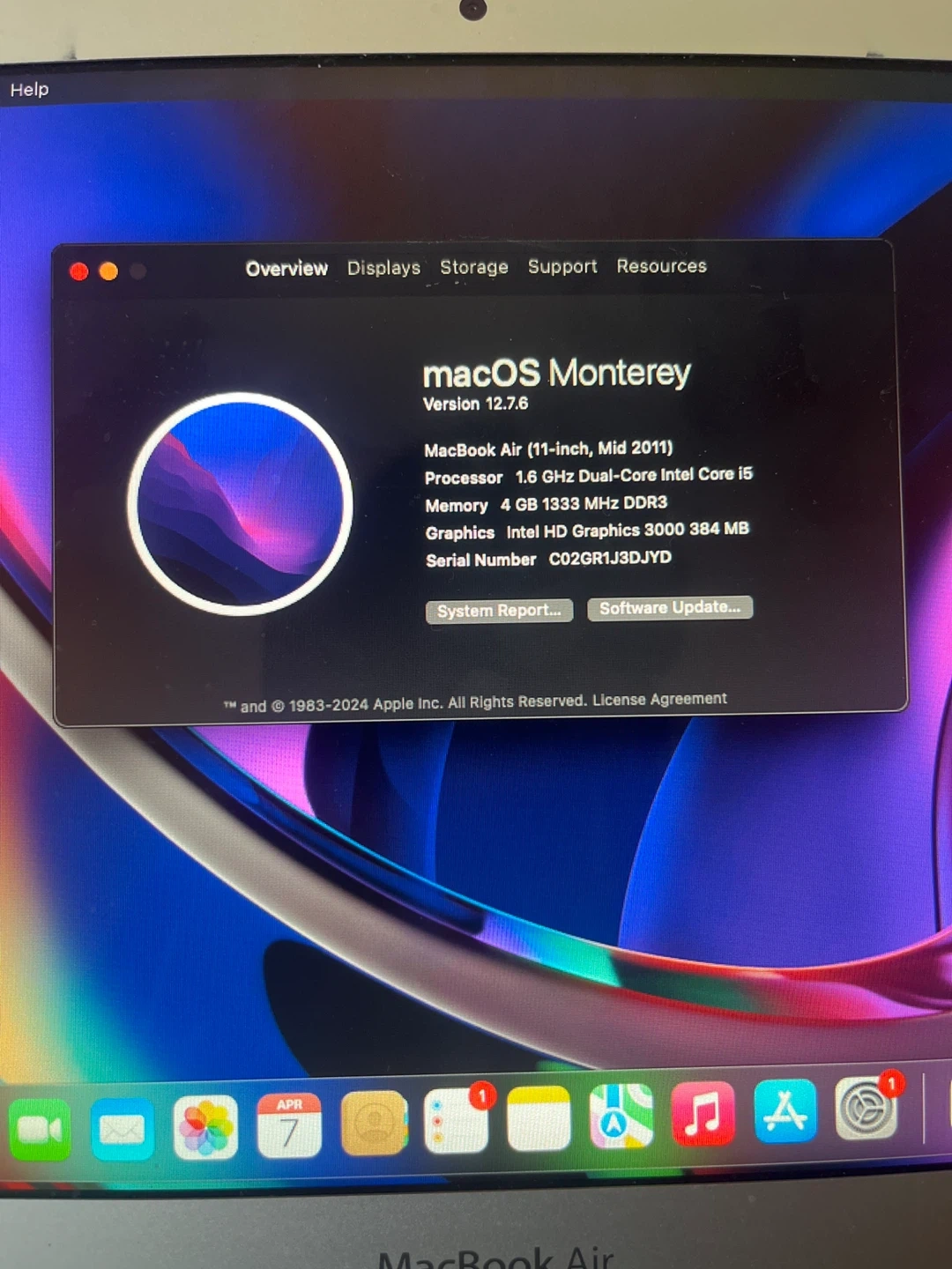 This is a mid-2011 MacBook Air laptop. It's running macOS Monterey (MacOS 12) and has 4 GB of RAM. The storage is around 120 GB flash storage. Great for simple tasks like browsing and watching videos or a nice computer for your kids.